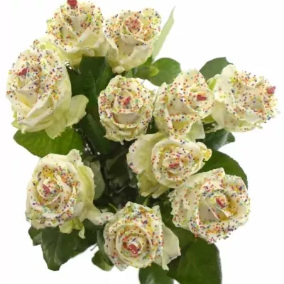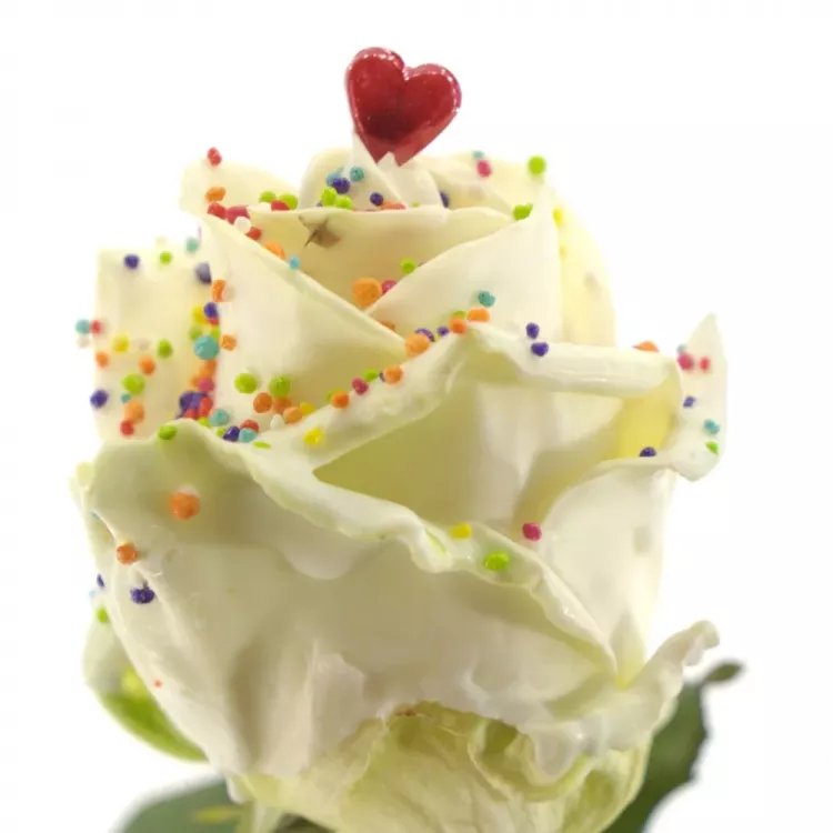 Chocolat Disco Love je růže s neotřelou estetikou, zdobená bílou čokoládou a pestrobarevnými třpytkami. Vytvořená holandskými mistry z VIP Roses Sassen, každá růže je pečlivě obalena a zdobena, aby zářila jako diskokoule.