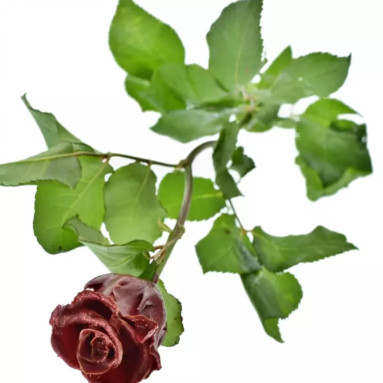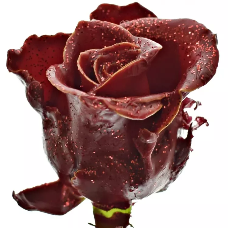 Ručně zdobená růže je zvýrazněna voskovým nátěrem a jemnými třpytkami, což jí dodává jedinečný lesk a dlouhotrvající krásu. S délkou stonku 50 cm a velikostí květu L, je ideální pro elegantní aranžmá nebo jako výrazný dárek.