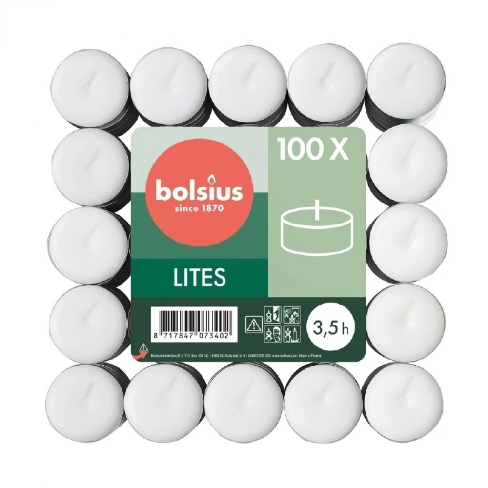 Praktické balení obsahuje 100 čajových svíček značky Bolsius, kde každá hoří až 3,5 hodiny. Je ideální pro ty, kdo hledají velké množství svíček s krátkou dobou hoření pro různé příležitosti. Neobsahují palmový olej, hoří čistým plamenem bez kouře a dohoří beze zbytku.