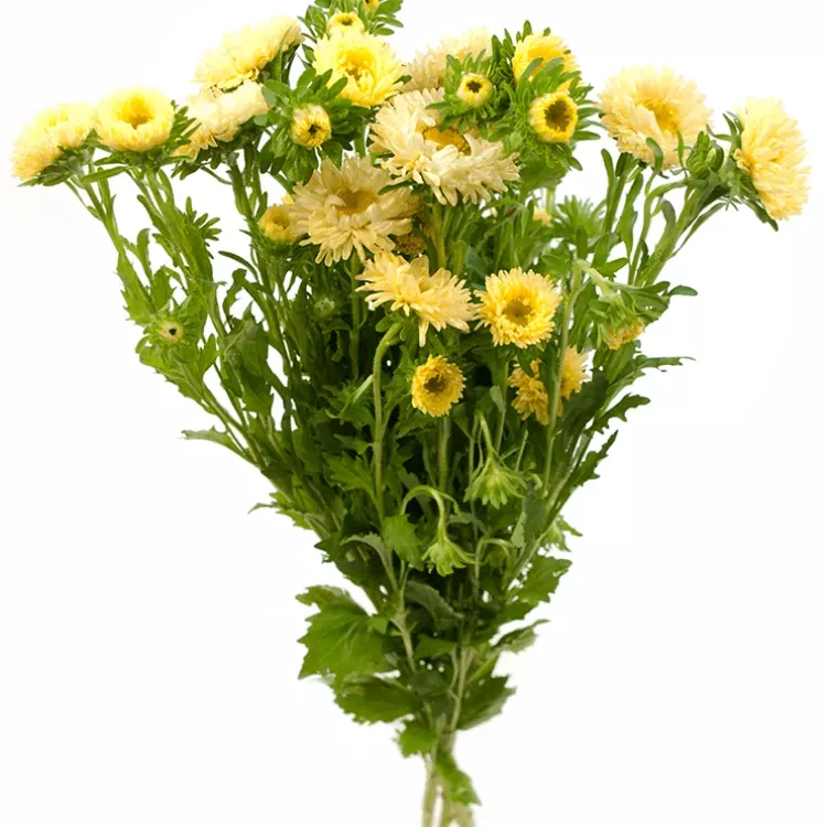 Žluté kulaté květy astry čínské přijdou vhod. Kultivar má podobnou skladbu květů jako chryzantémy, jsou tedy skvělou alternativou těchto květin. Každý květ má trochu jiný odstín žluté od jasnějších tónů až po barvy slunce.