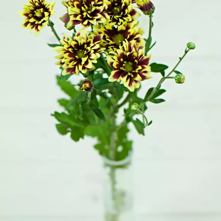 Péče o řezané chryzantemy: doporučujeme odstranit listy zasahující do vody. Vodu ve váze neměňte, ale pouze doplňujte. Stonky se neseřezávají, ale lámou nebo mačkají. Za správnou péči se Vám chryzantemy odmění až třítýdenní životností.