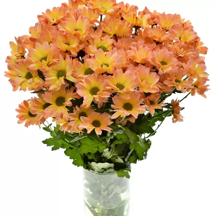 Péče o řezané chryzantemy: doporučujeme odstranit listy zasahující do vody. Vodu ve váze neměňte, ale pouze doplňujte. Stonky se neseřezávají, ale lámou nebo mačkají. Za správnou péči se Vám chryzantemy odmění až třítýdenní životností.