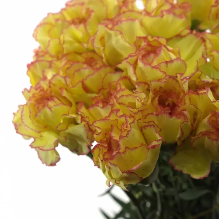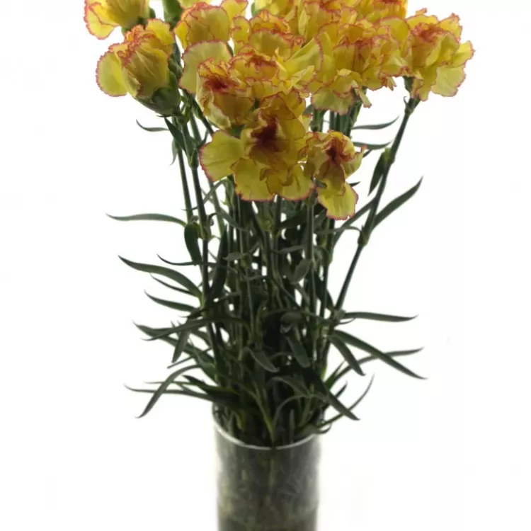 Dvoubarevné řezané karafiáty ST Milka Giallo Vás budou jistě bavit. Ve spojení s bohatou dekorační zelení a jednobarevnými, např. bílými růžemi, nádherně vynikne jejich hravost a barevné provedení.
