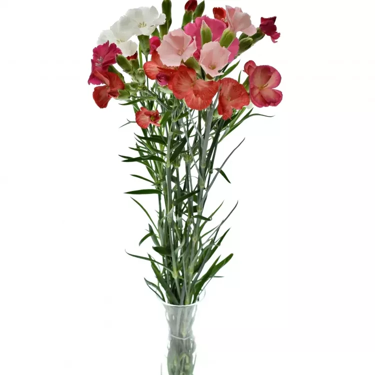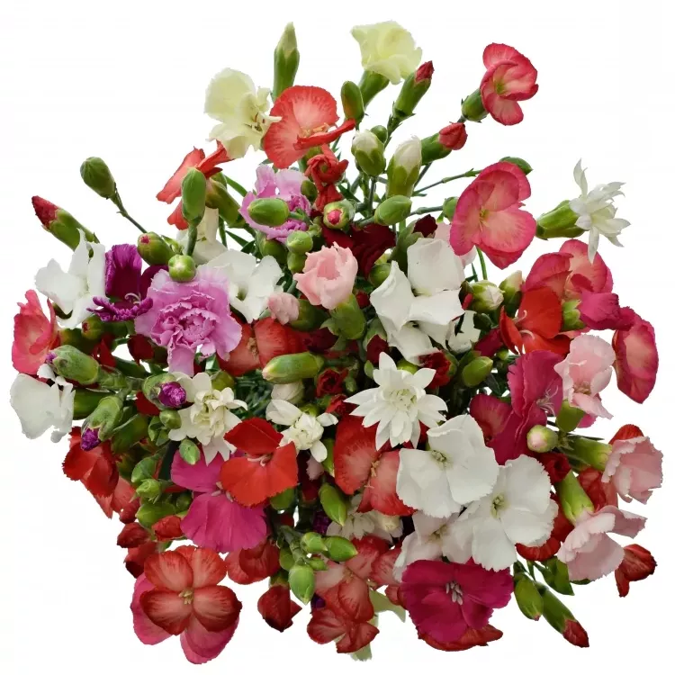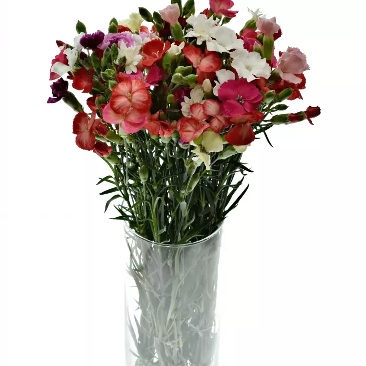Karafiát TR SOLOMIO MIX nabízí pestré barevné spektrum od jemných bílých, přes něžné růžové až po živé červené odstíny. Květy se vyznačují mnohokvětými hlavami, které jsou obzvláště bohaté na okvětní lístky, dodávající jim plný a atraktivní vzhled. Tato odrůda karafiátů je oblíbená pro svou výjimečnou výdrž a schopnost dlouho udržet svěžest ve váze.