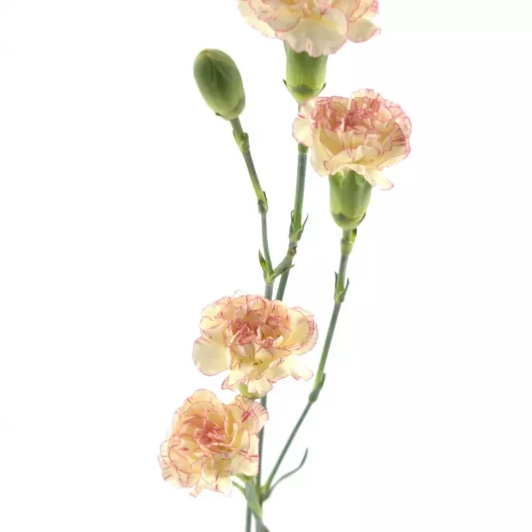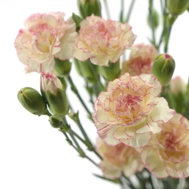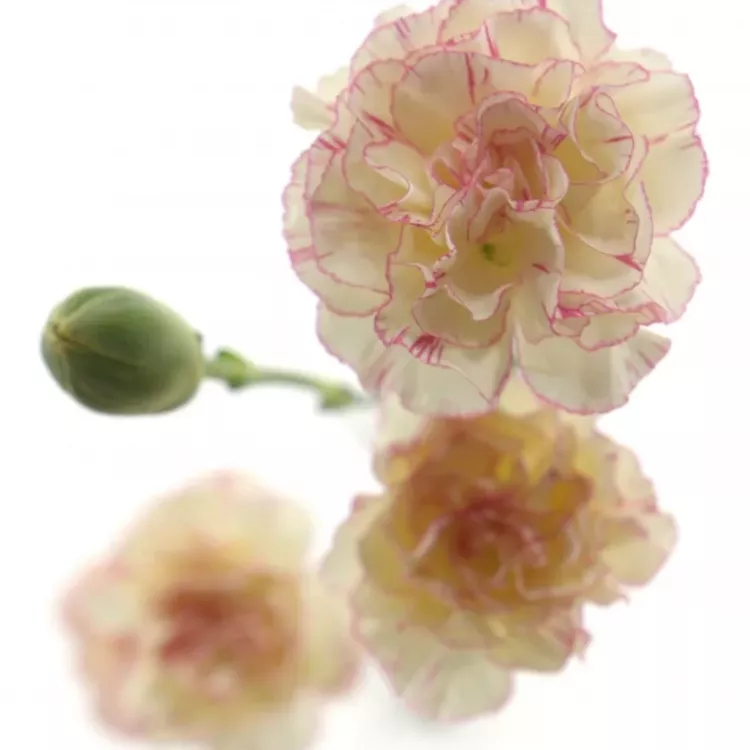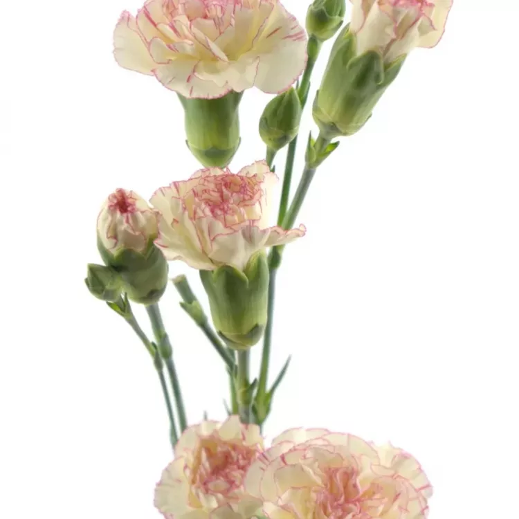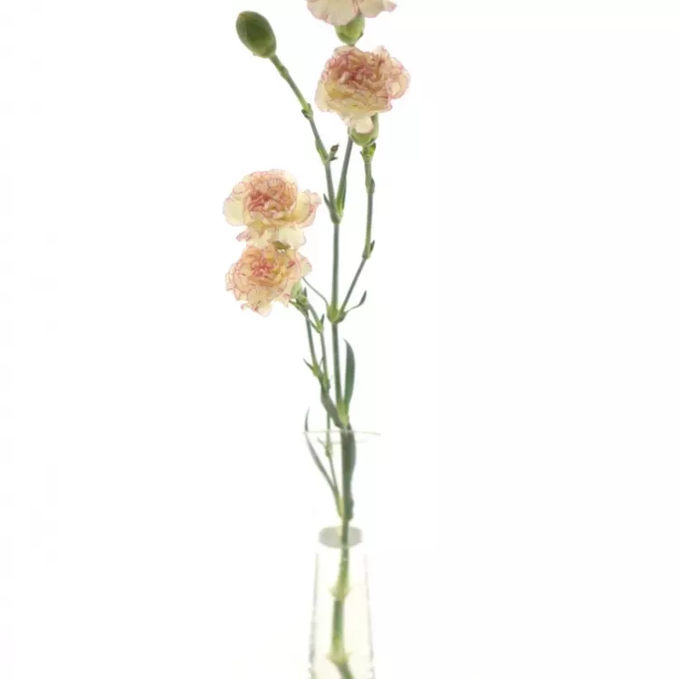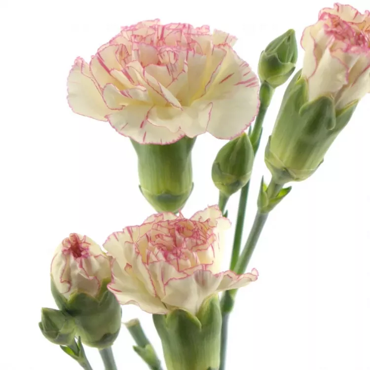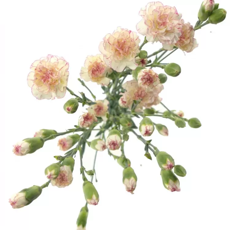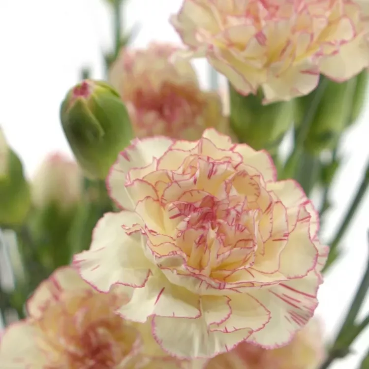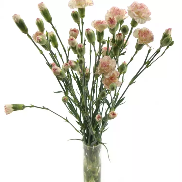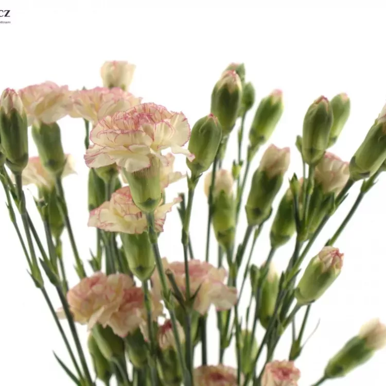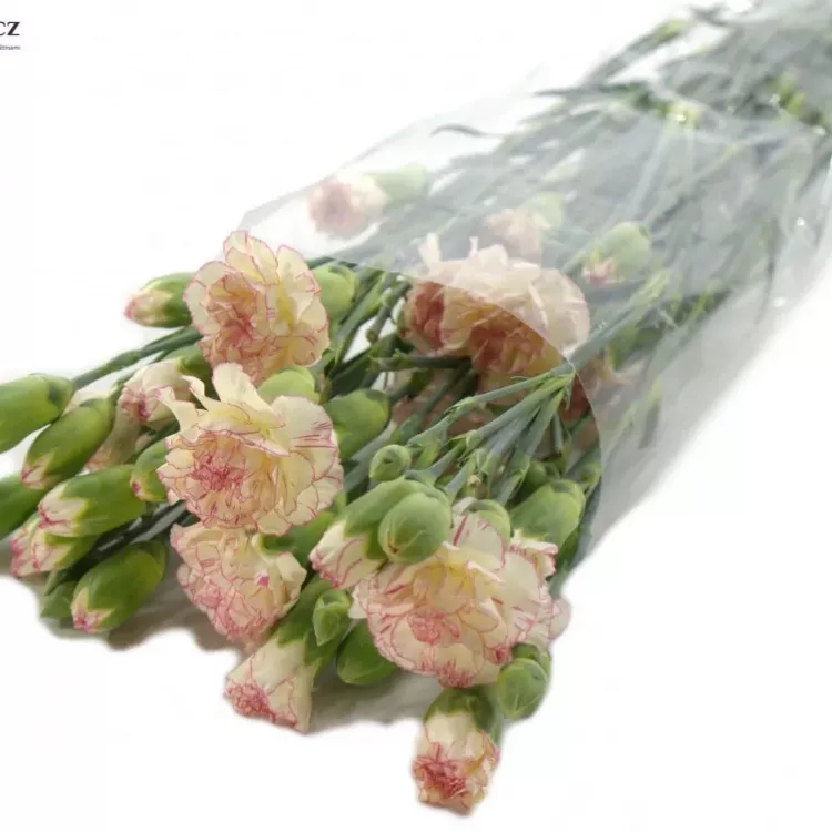 Karafiát TR NUMBER ONE je výjimečný pro své delikátně zbarvené květy s nádechem světle zelené a jemnými růžovými vrcholky. Jeho okvětní lístky jsou zdobené drobnými růžovými čárkami, což karafiátu dodává sofistikovaný vzhled.