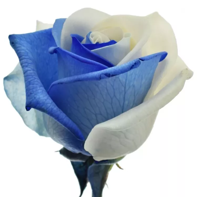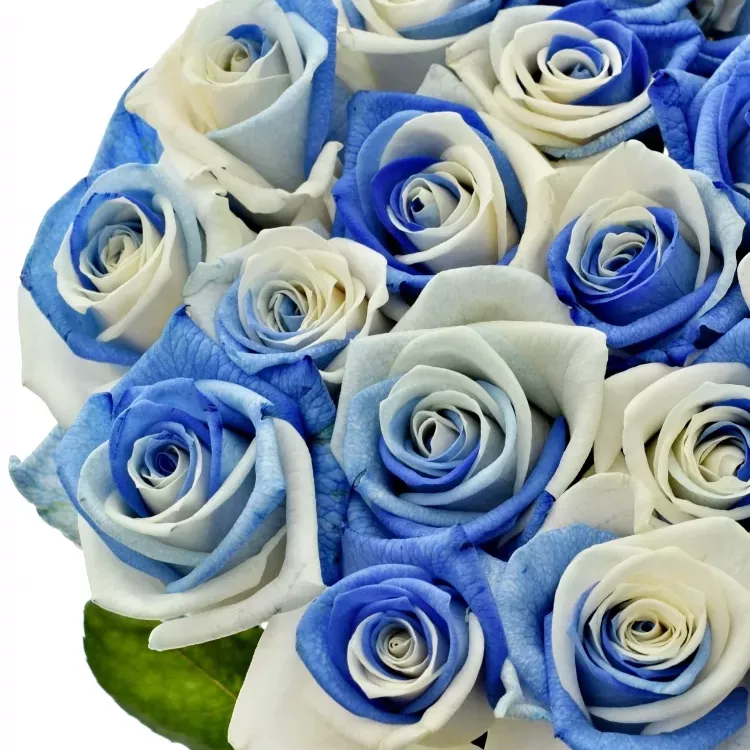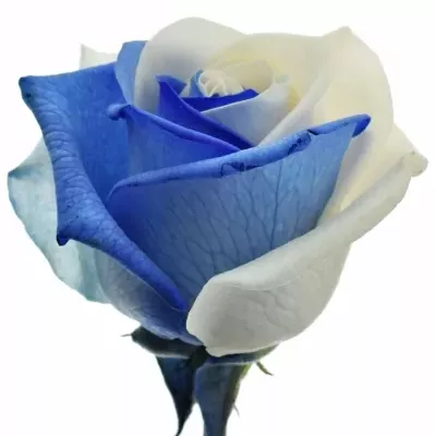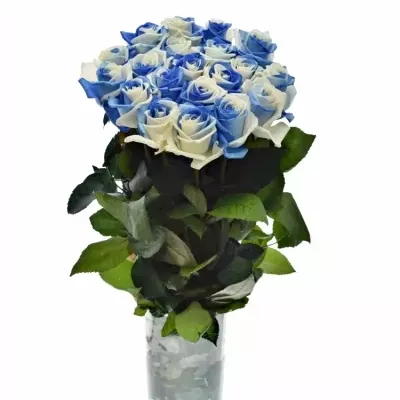 Unikátní ekvádorská, modro-bílá růže s velkým květem byla obarvena precizní holandskou technologií, metodou Rainbow. Růži nijak neškodí ani jí neubírá na kvalitě. Krásná kombinace barev bílé a modré probudí k životu každý interiér. Květ má na výšku až 5 cm a 8-9 cm na šířku, je měkký s pevným středem.