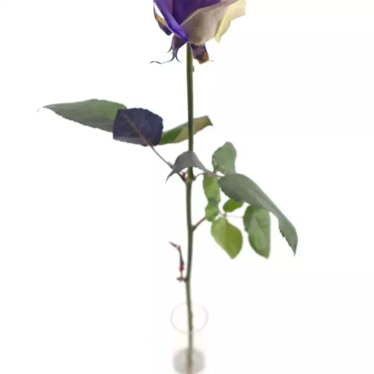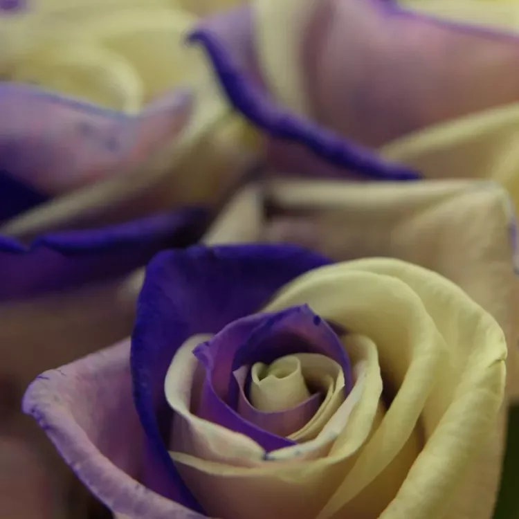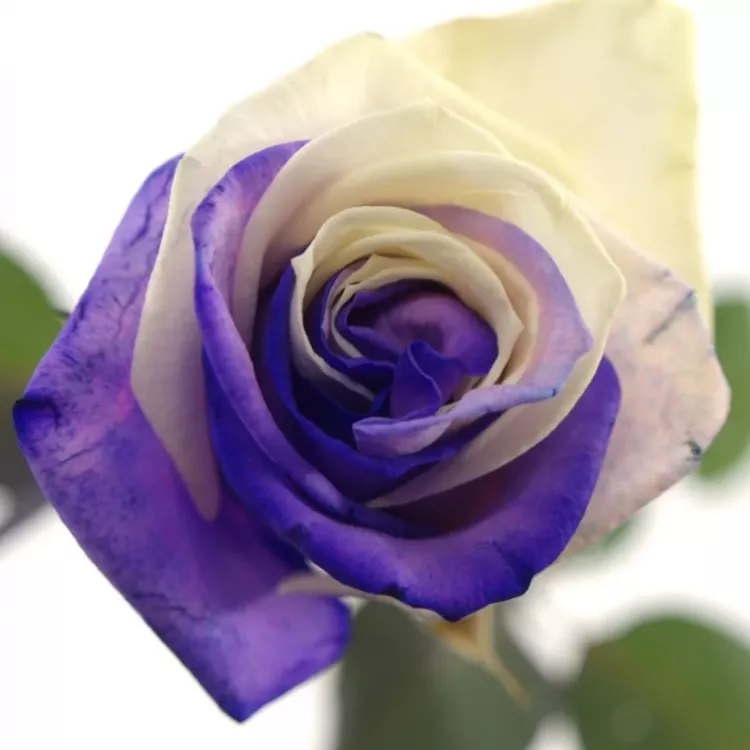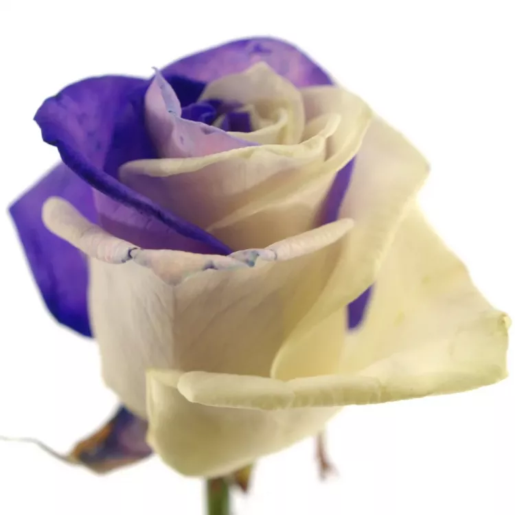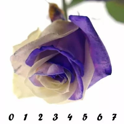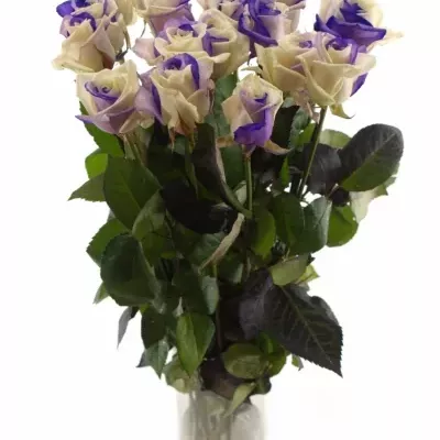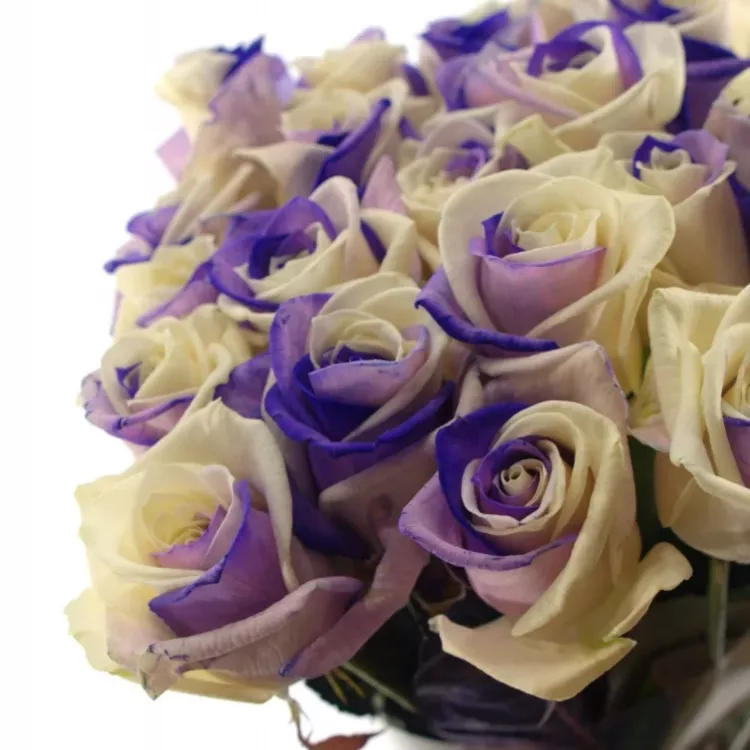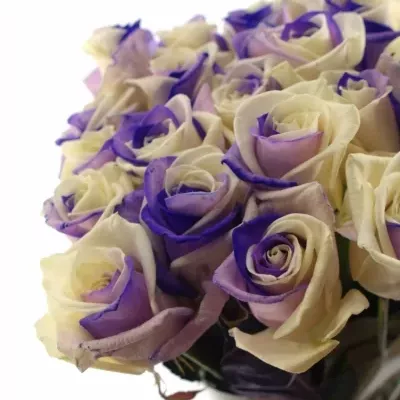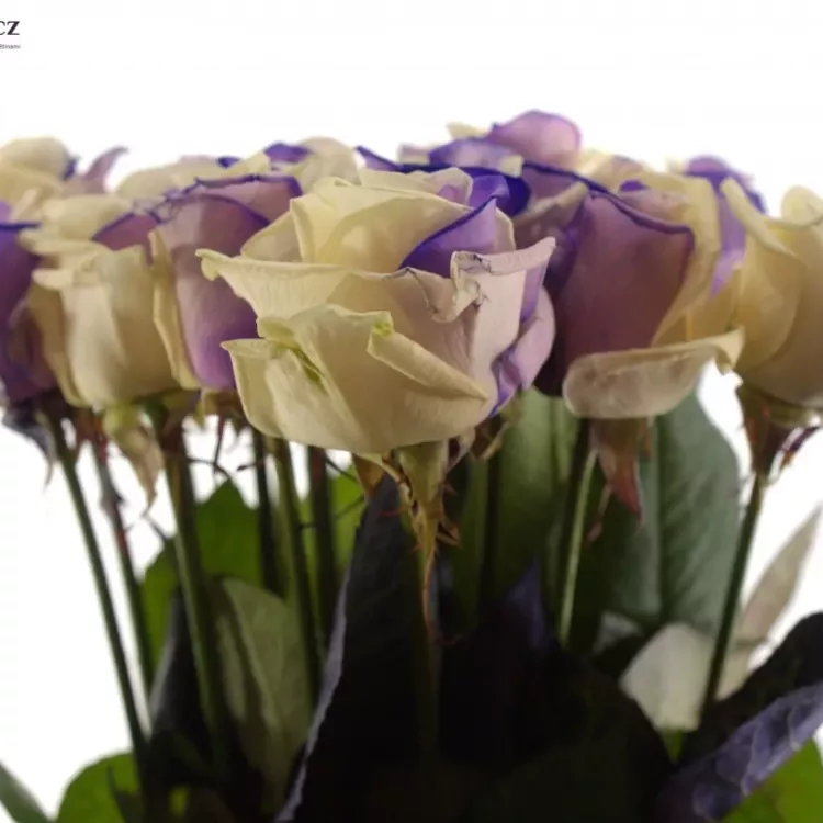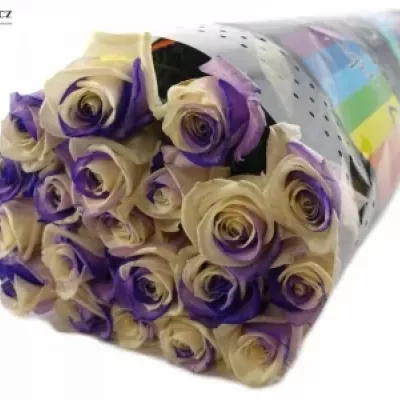Aneb poloduhové růže v bílo-fialové barvě. Růže jsou částečně obarveny za pomoci speciální a zdravotně nezávadné technologie. Krásně se hodí pro speciální momenty a tématické události.
