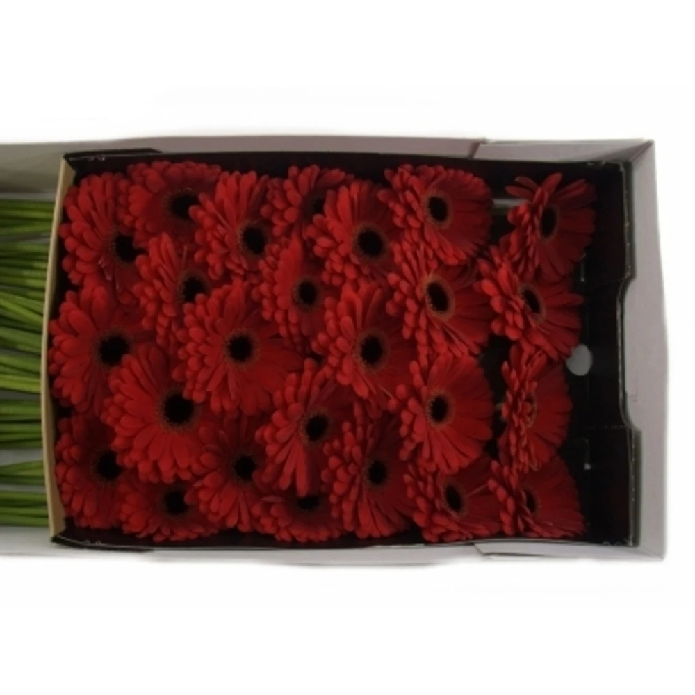 Gerbera GR LADIES FIRST se vyznačuje sytě červenými lístky s jemnými světlejšími tóny na okrajích a tmavým, téměř černým středem. Je to vysoce oblíbená odrůda pro svou výraznou barvu a velké květy.