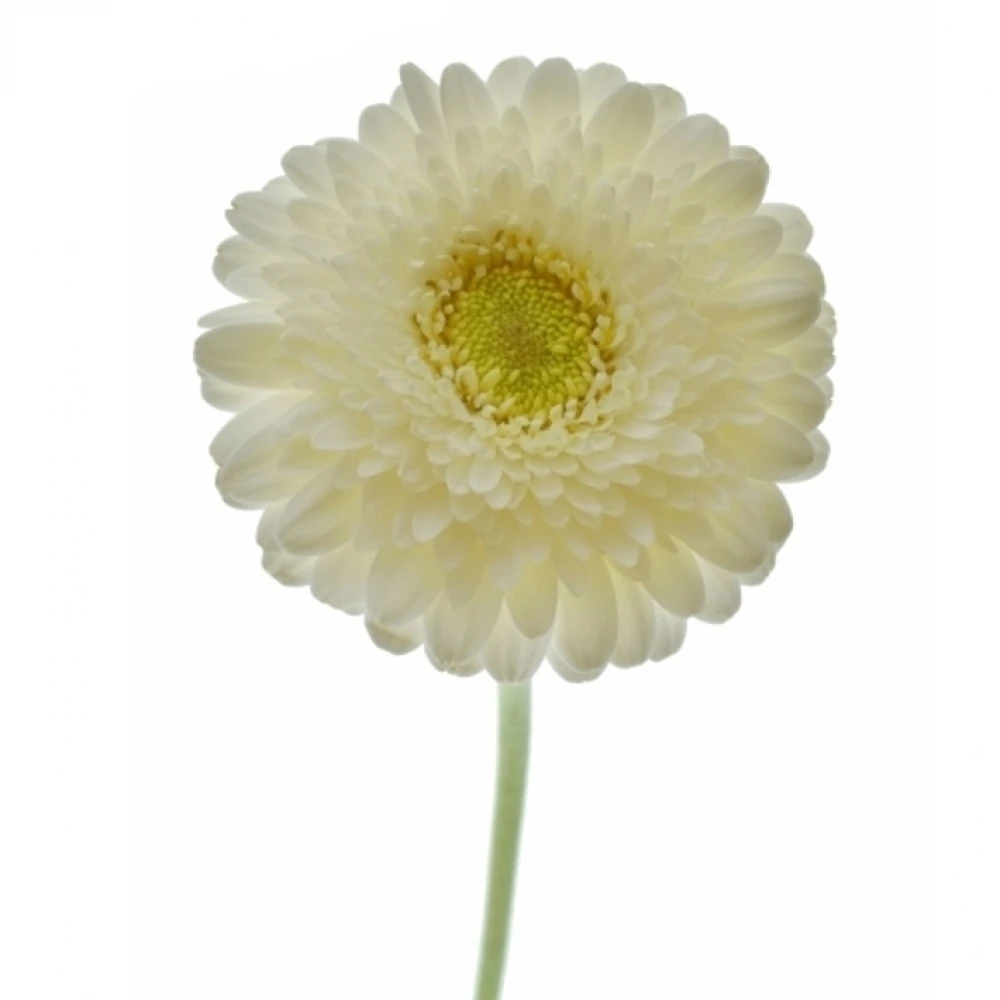 Mini Gerbera Bolvormig Gerponi Blanco je okrasou každé květinové kompozice, se svým plným kulatým tvarem a krémově bílými okvětními lístky, které se skládají do dokonalé harmonie kolem teplého zlatavého středu. Odolnost a dlouhodobá svěžest této odrůdy jsou výsledkem pečlivého šlechtění.