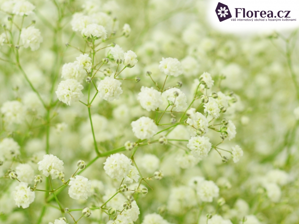 Gypsophila je vytrvalá květina s dřevnatým kořenem a několika bohatě větvenými lodyhami. Je známá jako dekorační zeleň, která se využívá především do svatebních vazeb. Bohatě se uplatní také v okrasných zahradách. Nejlépe vynikne v kytici rudých růží. Gypsophilu můžete zakoupit v délkách od 50 do 90 centimetrů online na Florea.cz