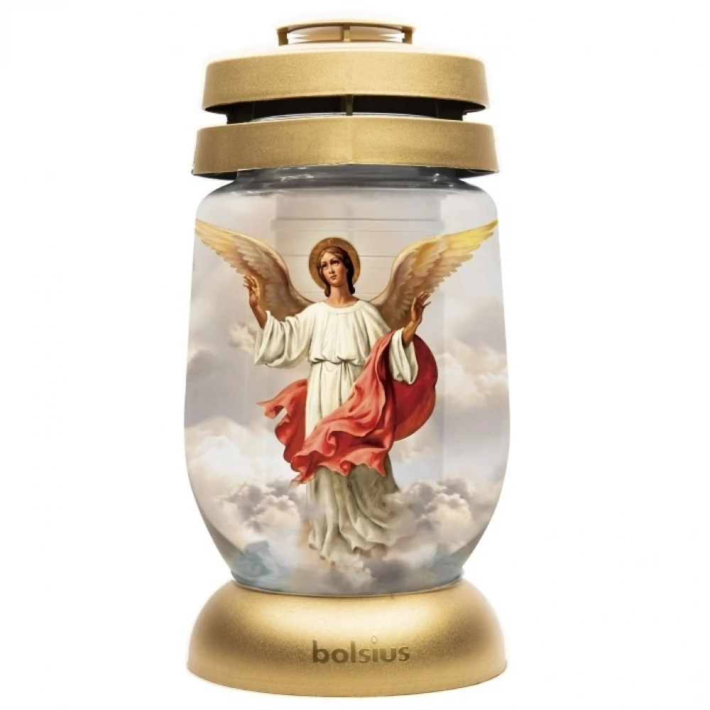 Tato lucerna je symbolem ochrany a nebeské přítomnosti, kterou představuje její andělský motiv. Její teplé světlo a zlatý lesk působí uklidňujícím dojmem a přináší pocit míru a naděje v chvílích vzpomínek.