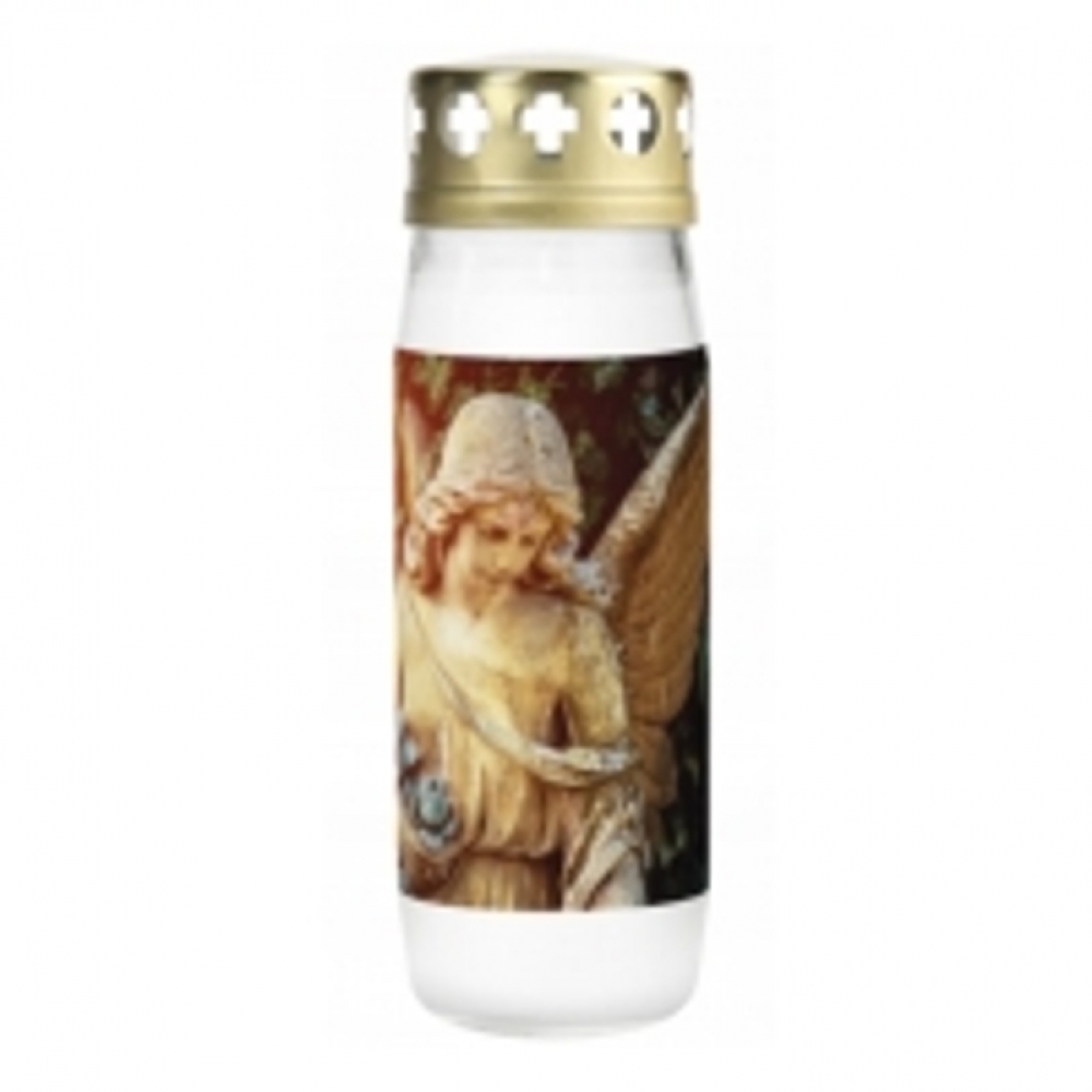 Až 72 hodin svítí hřbitovní svíčka s víčkem a motivem anděla. Díky kvalitnímu provedení její náplň dohoří beze zbytku. Víčko je navrženo pro ochranu plamene před vnějšími vlivy, což zajišťuje dlouhodobé a spolehlivé hoření bez ohledu na počasí.