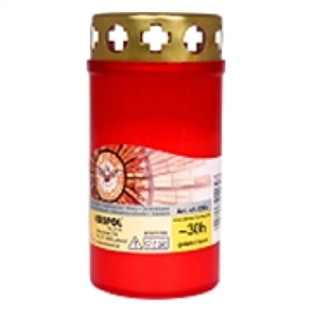 Hřbitovní svíčka v červeném provedení s víčkem přináší až 30 hodin hoření. Praktické víčko ochraňuje plamen před nepříznivým počasím a zajišťuje stabilní světlo. Její nespornou výhodou je dohoření kvalitní náplně beze zbytku.