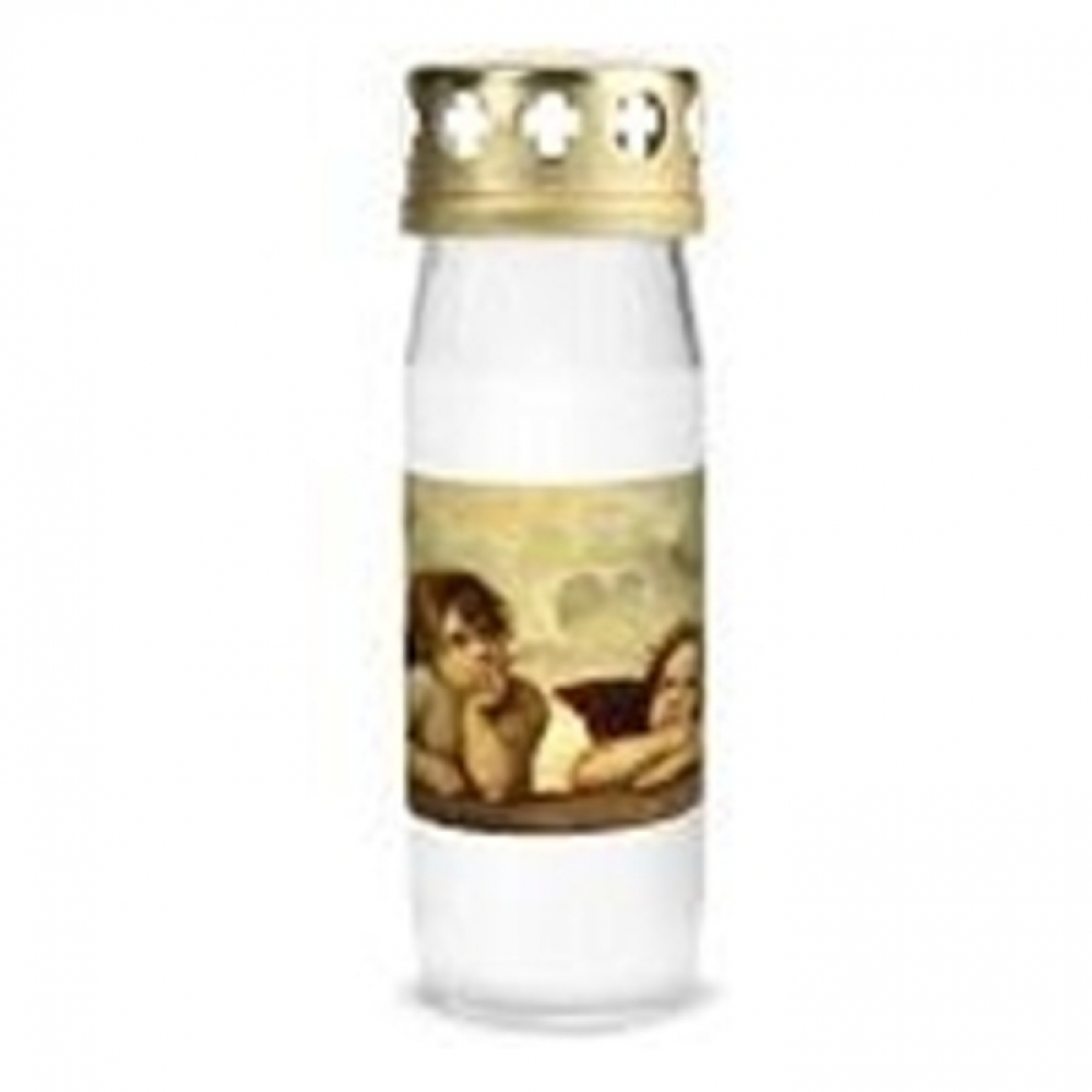 Jedinečná hřbitovní svíčka s víčkem zdobená motivem dvou andělů ze slavného obrazu Raffaela Santiniho poskytuje až 72 hodin světla. Mezi její přednosti patří dohoření náplně beze zbytku. Je navržena pro venkovní použití, s odolným víčkem, které chrání plamen před nepříznivými povětrnostními podmínkami a zajišťuje stálý plamen.
