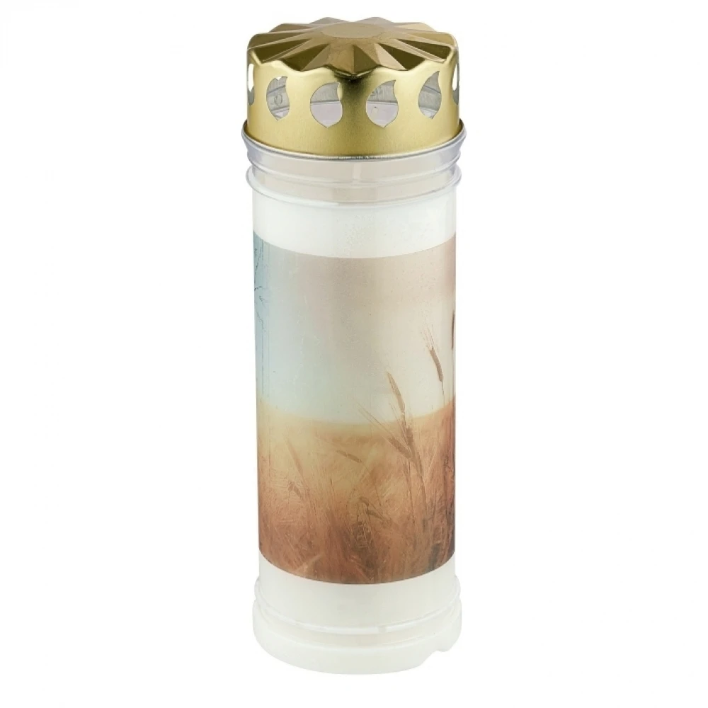 Hřbitovní svíčka s víčkem a obrazem pole s obilím hoří neuvěřitelných 168 hodin a její kvalitní náplň dohoří beze zbytku. Díky víčku, které chrání plamen odolává vnějším podmínkám a zajišťuje dlouhou dobu svícení.