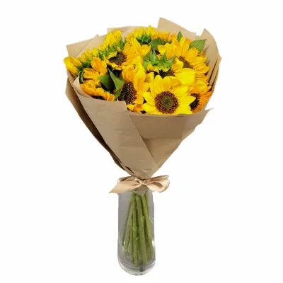 Naše šikovné floristky kytici doplnily elegantním dárkovým papírem, který zdůrazňuje jasnou barvu květů a jejich líbezný tvar. Rozhodnout se můžete i pro variantu s 9 nebo 21 slunečnicemi.