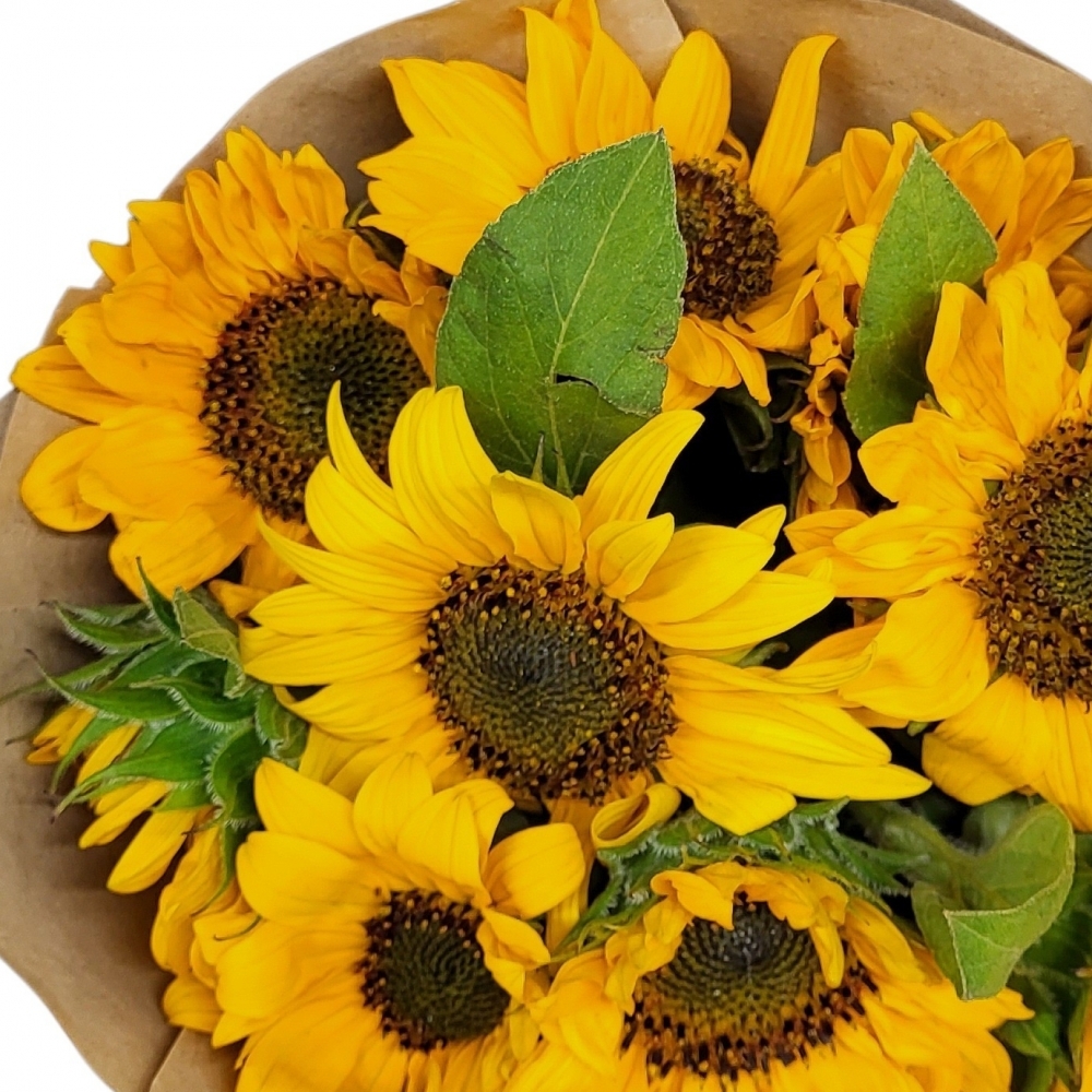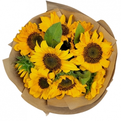 Krásu květů zdůrazňuje přírodně laděný dárkový papír. Vybírat můžete i z dalších variant kytice, máme ji pro vás i s 15 nebo 21 slunečnicemi.