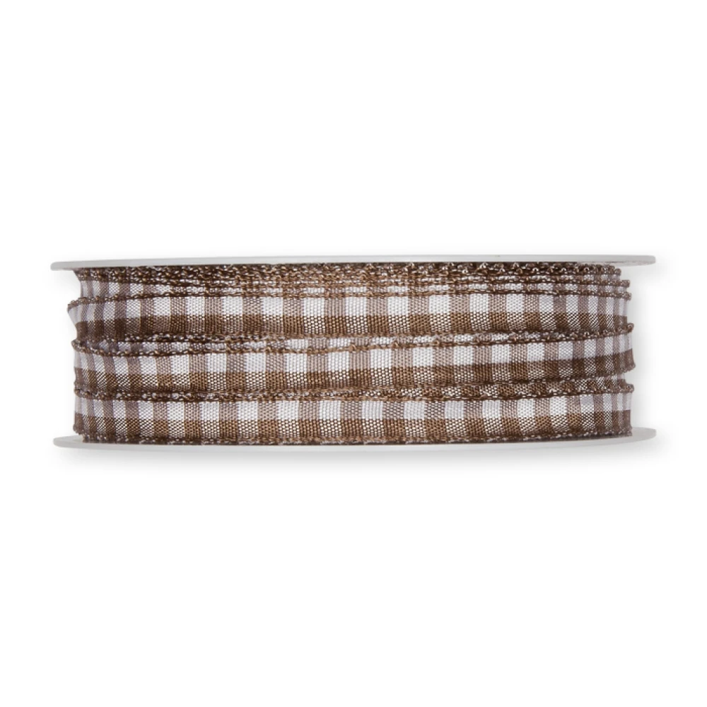Kostkovaná stuha s drátěným okrajem - tmavě hnědá 8mm x 25m