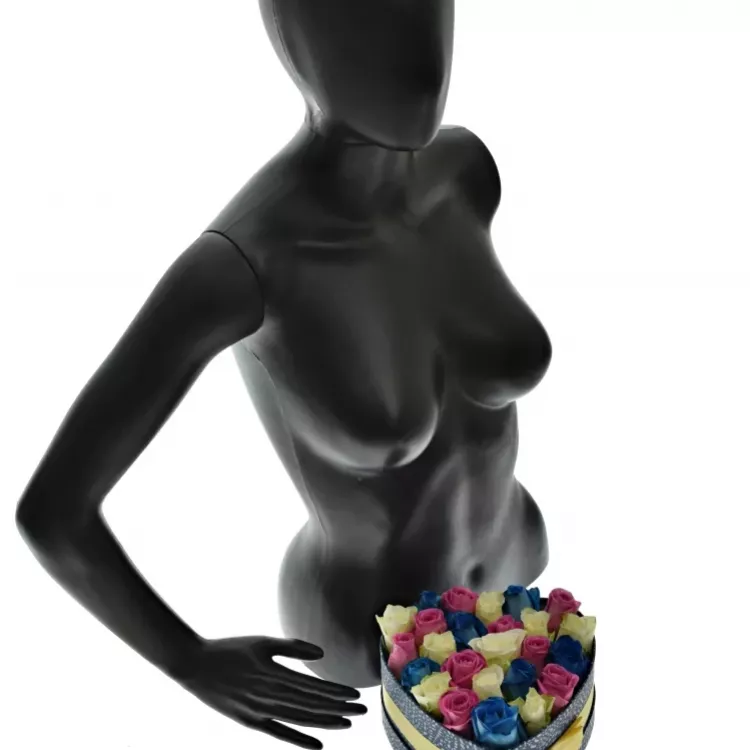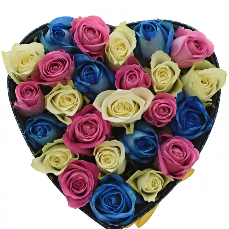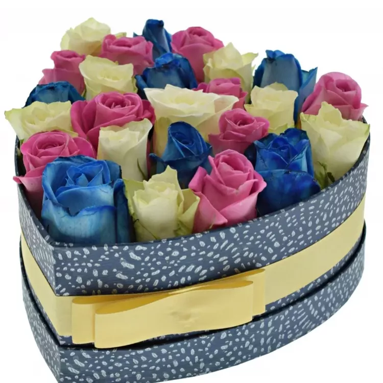 Krabička přímo hraje barvami. Kombinace modrých, bílých a růžových růží je veselá a hravá, určená právě pro ženy, které se rády baví a není s nimi nikdy nuda. Probarvěte jim narozeninový den netradičním a pozitivním květinovým dárkem.