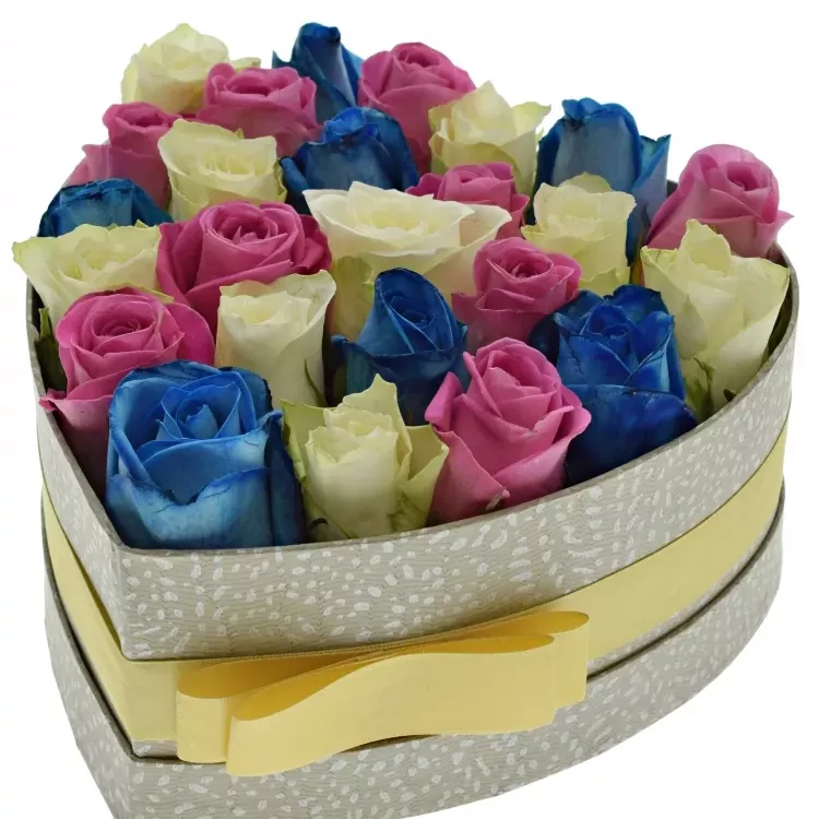 Krabička přímo hraje barvami. Kombinace modrých, bílých a růžových růží je veselá a hravá, určená právě pro ženy, které se rády baví a není s nimi nikdy nuda. Probarvěte jim narozeninový den netradičním a pozitivním květinovým dárkem.