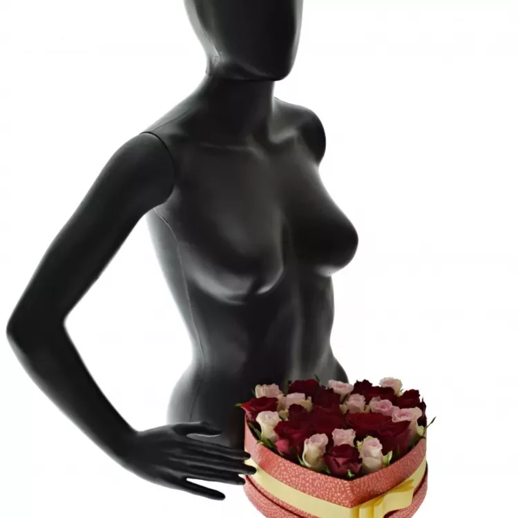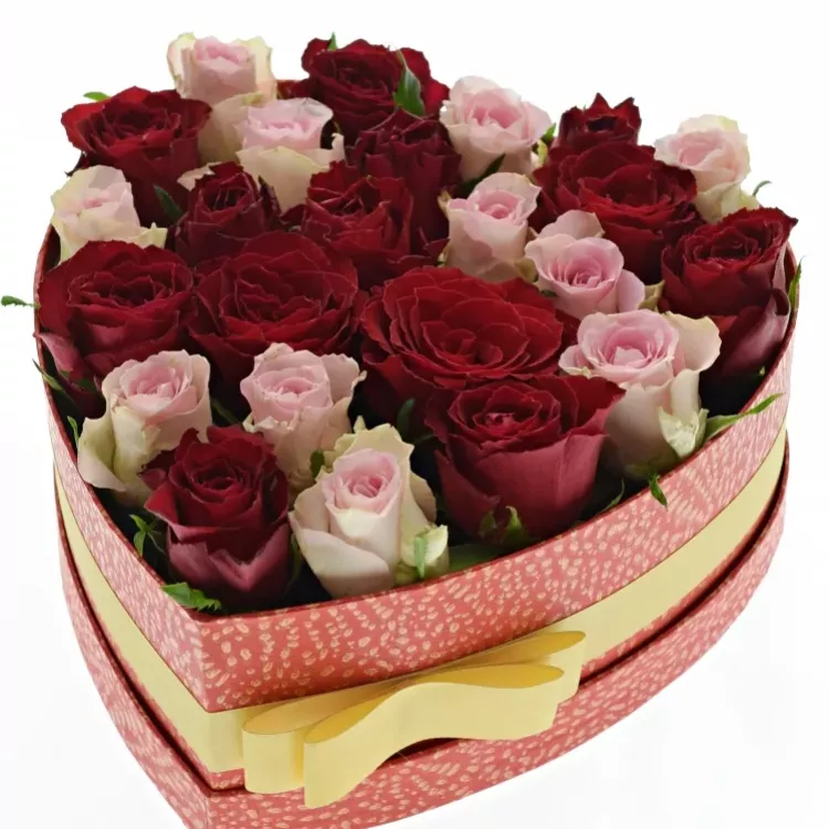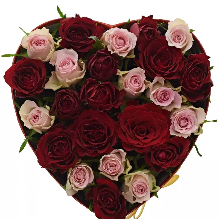 - Červená krabička ve tvaru srdce je plná červených a světle růžových růží,
