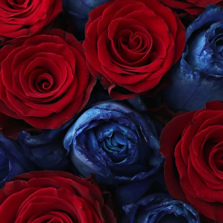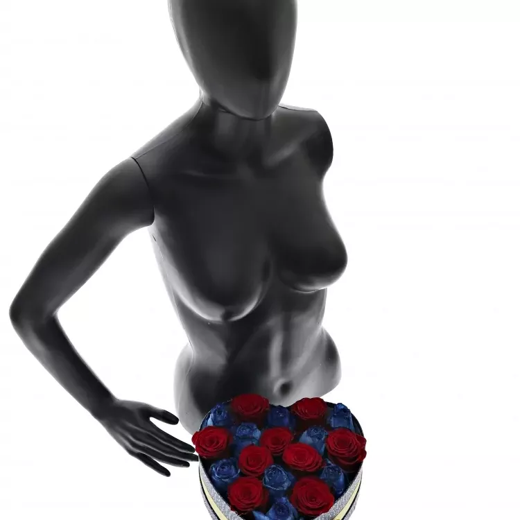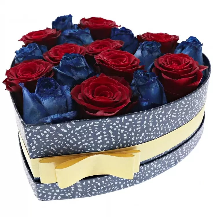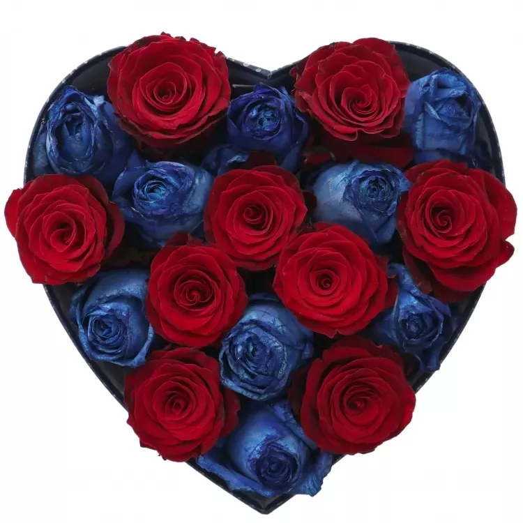 Krabička plná rudých a modrých růží v sobě ukrývá romantické poselství. Rudé růže vyjadřují ty nejhlubší city a vášeň. Květy vzácných modrých růží symbolizují věrnost a oddanost. Dohromady modré a rudé růže řeknou vaší milé více než tisíc zamilovaných slov.