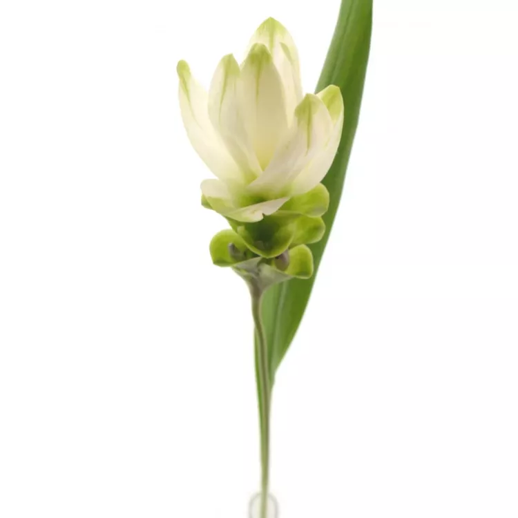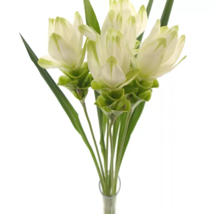 Curcuma, česky jednoduše kurkuma, je exotická bylina, jejímž původem je Jihovýchodní Asie. Tato až 1 metr vysoká rostlina s oválnými listy a světle fialovými květy se řadí do čeledi zázvorovitých. Curcuma se nevyužívá pouze ve floristice, ale také jako koření, které je nám známo jako zázvor a vyrábí z kořene této rostliny. Curcumu můžete zakoupit online v délkách 45 a 55 centimetrů.