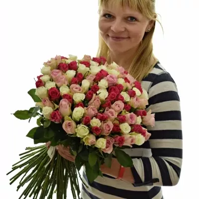 Kytice 100 míchaných růží Haskel je jako pestrý záhon ve zahradě. Každá růže byla pečlivě vybrána, aby přinesla radost a závan luxusu do každého prostoru, ať už je to domov, kancelář nebo jakékoliv slavnostní setkání. Je symbolem lásky, oceňování a vznešené krásy, ideální pro výročí, svatby nebo jako gesto díků.