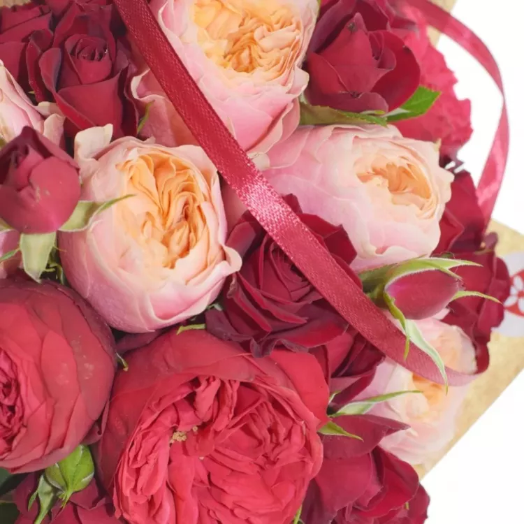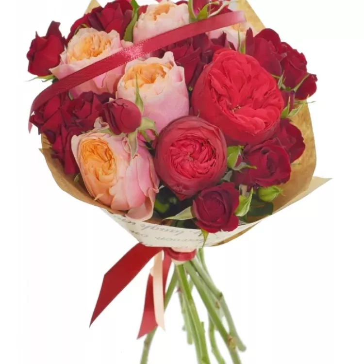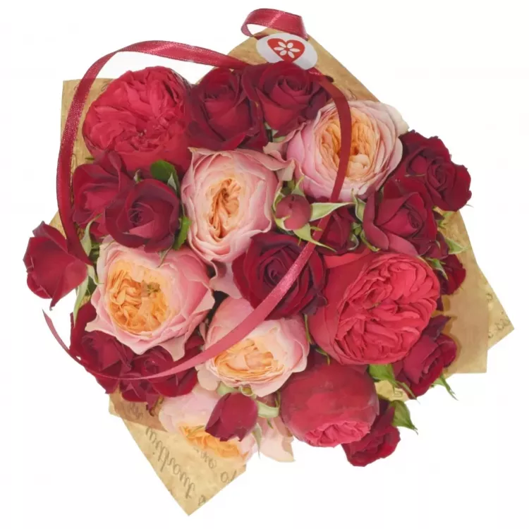 Základ kytice tvoří velké pivoňkové květy červených růží a stejně barevné menší trsové růžičky. Jiskru této červené kytici vdechly žluté růže Vuvuzela s "nekonečným" květem. Výsledkem je kytice, která je elegantní a veselá zároveň.