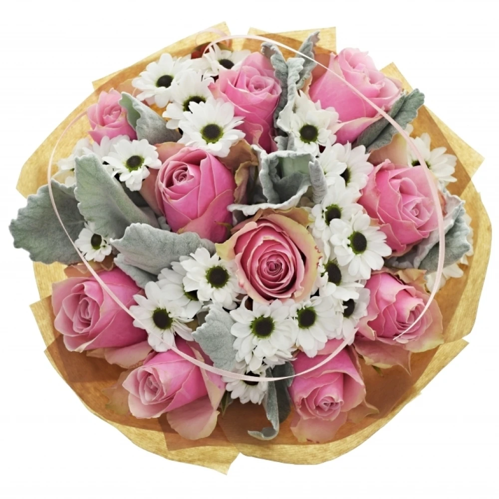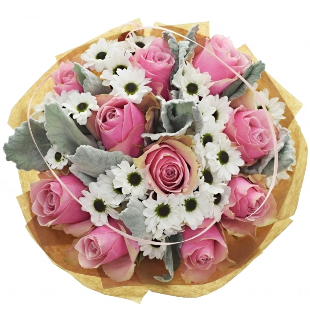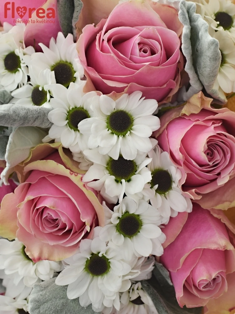 Kytice INGRID je jako jarní ráno, kdy se probouzí příroda. S kombinací růžových růží, bílých chryzantém a šedozelených listů přináší do každého prostoru svěžest a eleganci. Tato kytice je ideální pro svatby, narozeniny, nebo jen jako způsob, jak říci "děkuji" nebo "miluji tě".