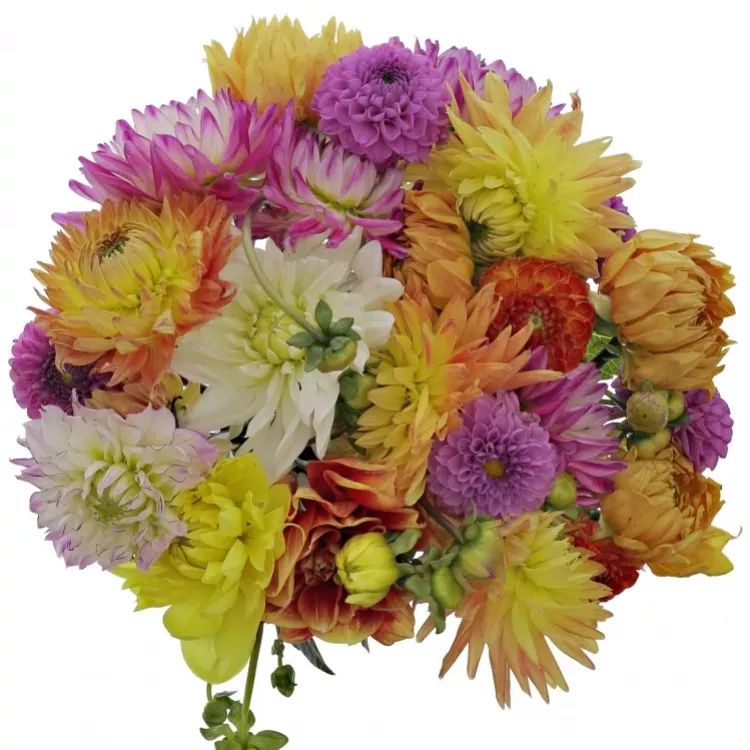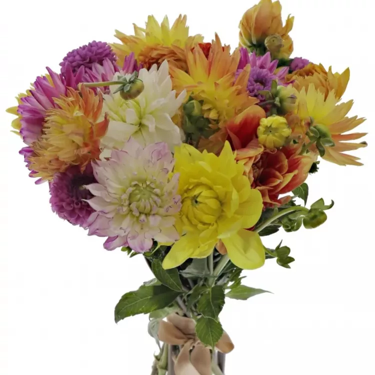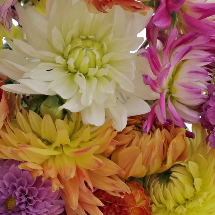 Pestrobarevná kytice jiřin, květin, které pochází až z Mexika