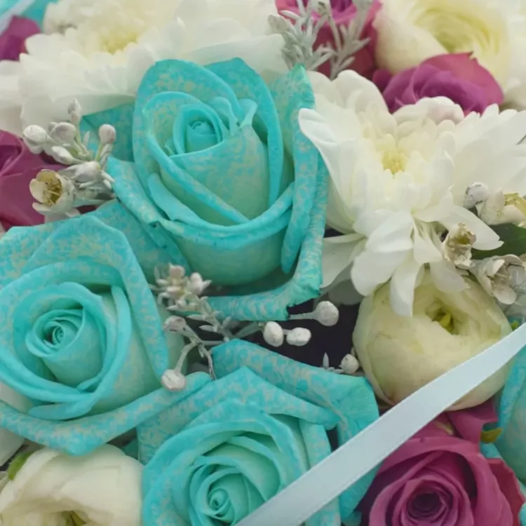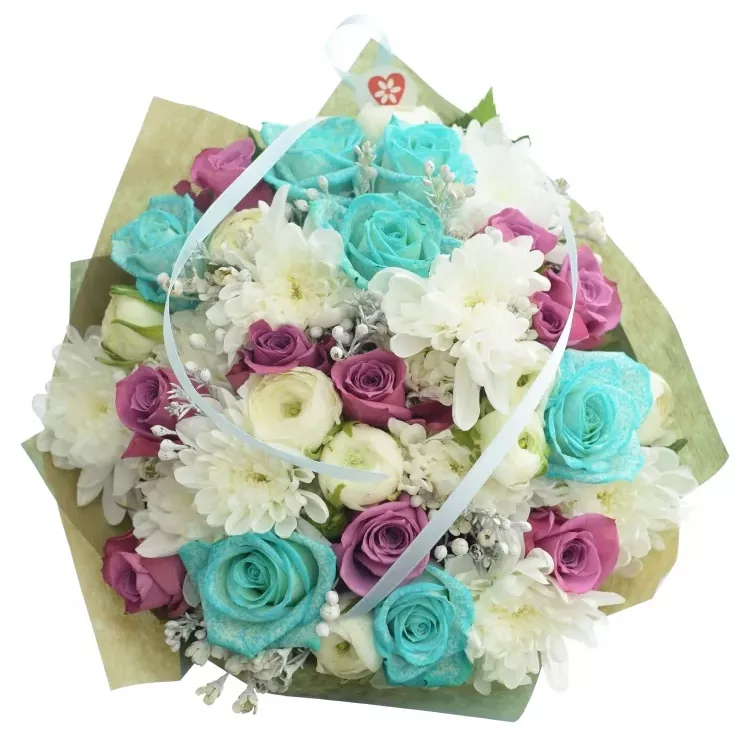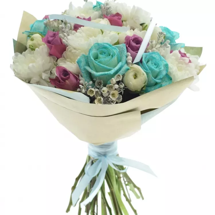 Možná, že tahle kytice připomíná chladné počasí, ale když důvod obdarování bude od srdce, jistě zahřeje. Apollonii pro vás uvážeme ledově modrých a elegantně fialovorůžových růží. Ještě větší šmrnc má kytice díky sněhově bílým chryzantémám. Voskáč a pryskyřník na závěr dotváří krásně kulatý tvar.