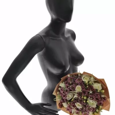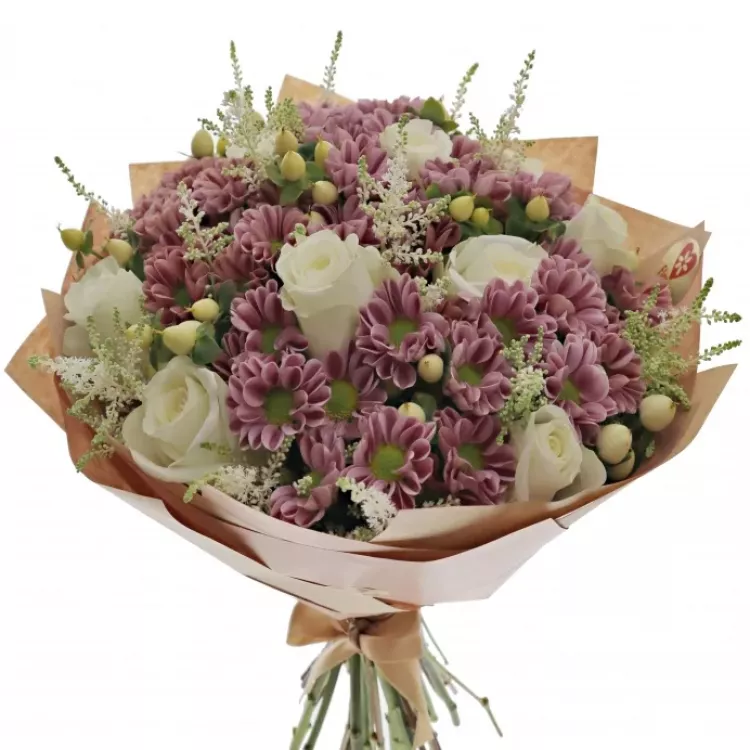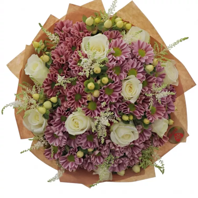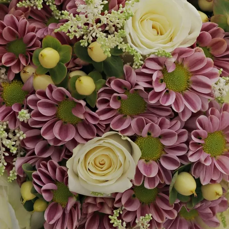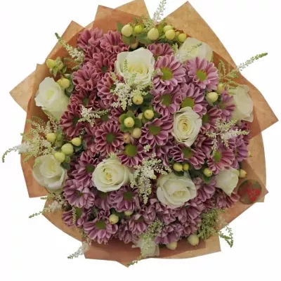 Kytici Sweet Sandra ocení především milovnice nostalgických tónů barev. Starorůžové chryzantémy vyniknou v kombinaci s bílými květy růží, zatímco bílé bobulky třezalek a bílá kvítka astilbe podtrhují vintage nádech kytice.