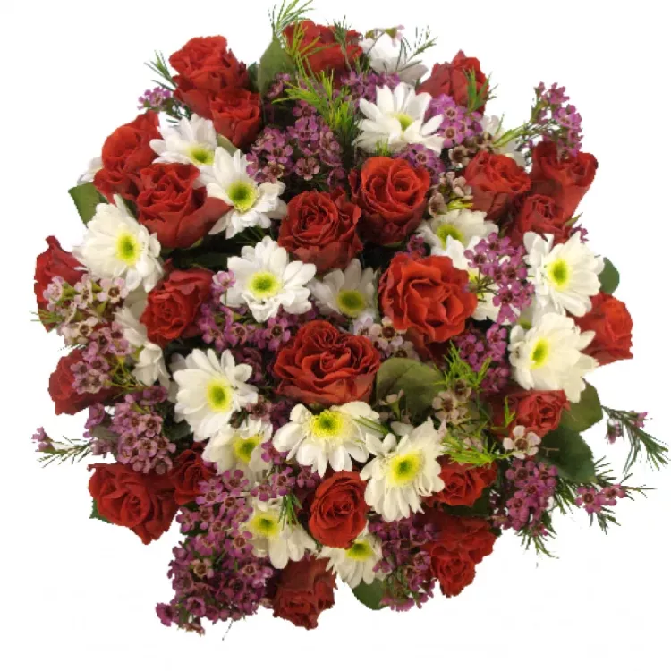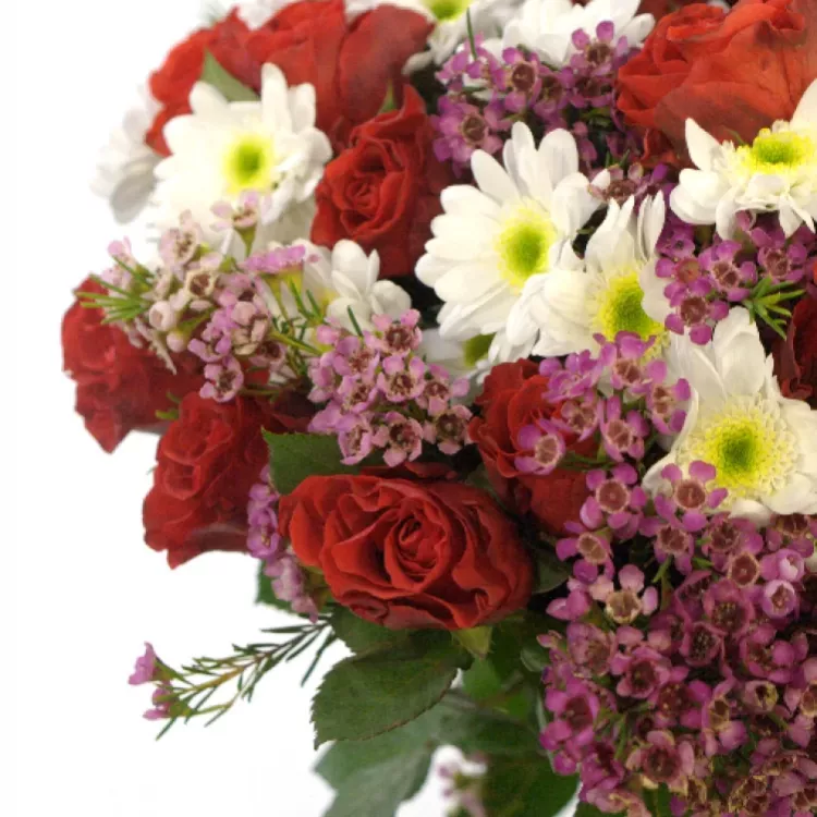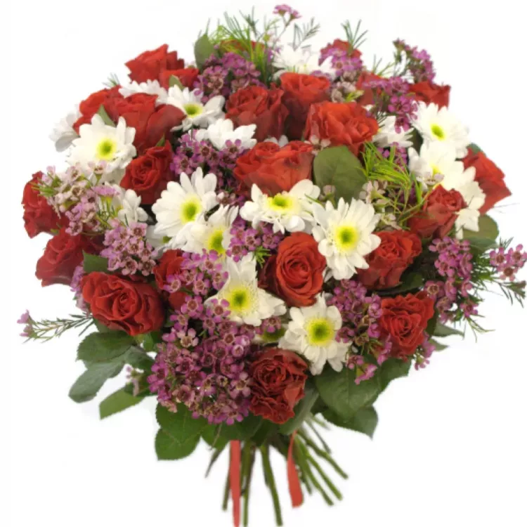 Romantická, veselá, ženská kytice, která ještě více podtrhne krásu ženy, která ji bude svírat v náručí. Nechybí červené růže, kterým přizvukují chryzantémy a voskáče - jarní a svěží parťáci do kytice.