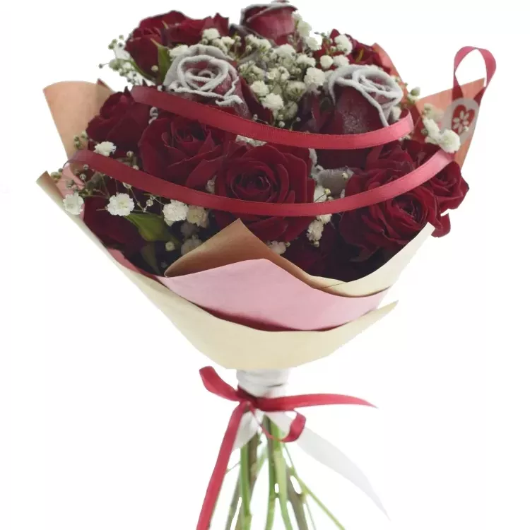 Darujte tuhle kytici třeba na znamení, že Vaše láska vykvetla v zimě. Aphreu pro Vás uvážeme ze speciálních "namrzlých" růží, menších červených trsových růžiček a nevěstina závoje. Speciální růže nejsou umělé, jsou to růže čerstvé a upravené speciální technologií.