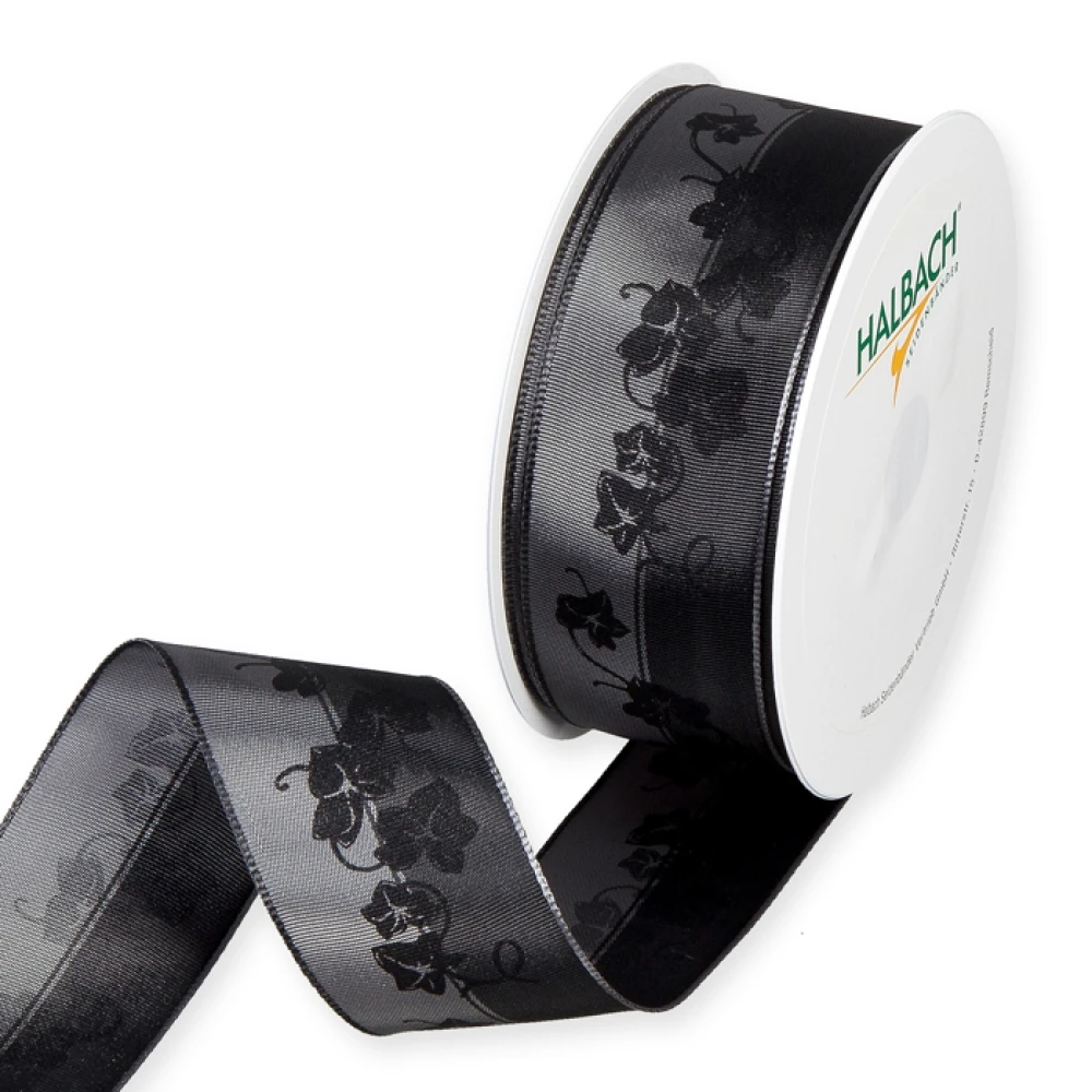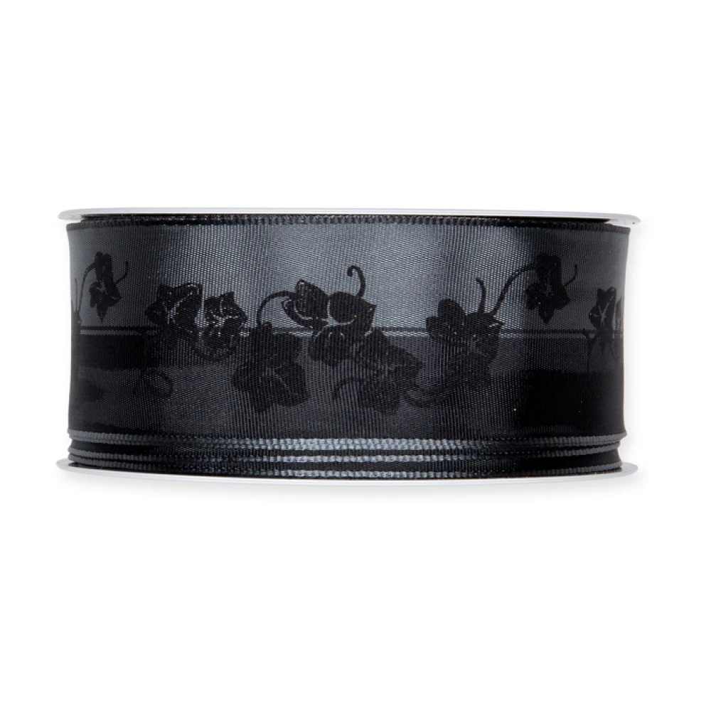- Lesklá smuteční stuha s potiskem břečťanu a drátěným okrajem šedá 40mm x 20m
