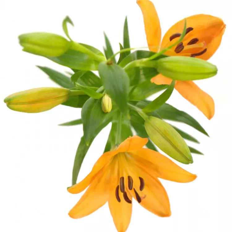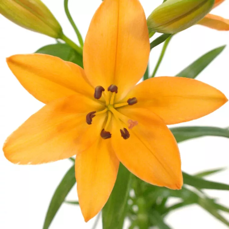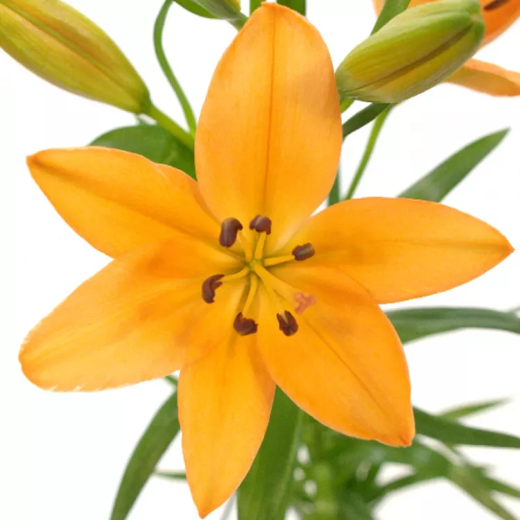 Těžko přehlédnutelná hybridní lilie Bariton má vzpřímené oranžové květy s pomerančovým nádechem. Jen tak ve váze, ale i v míchané kytici nenechá snad nikoho chladným.