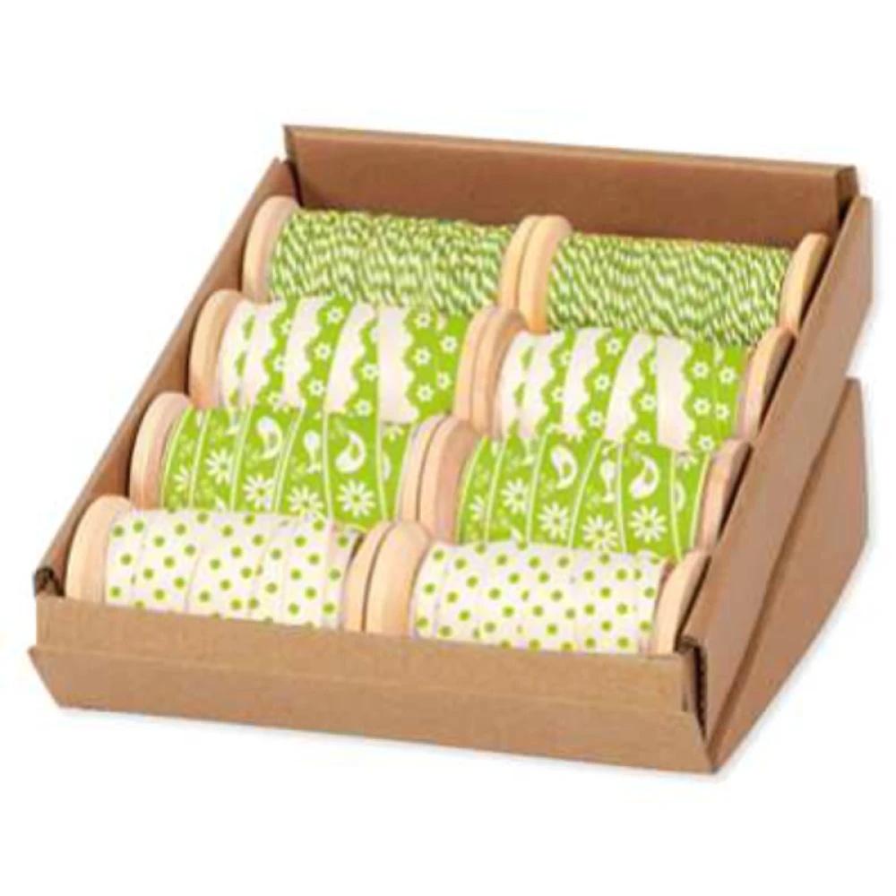 - Mix 8 bavlněných stuh na dřevěných cívkách zelená 6 x 5m + 2 x 25m