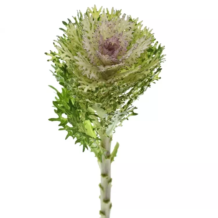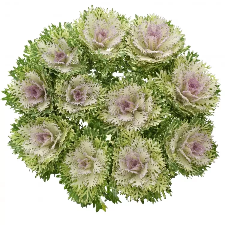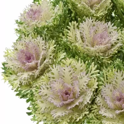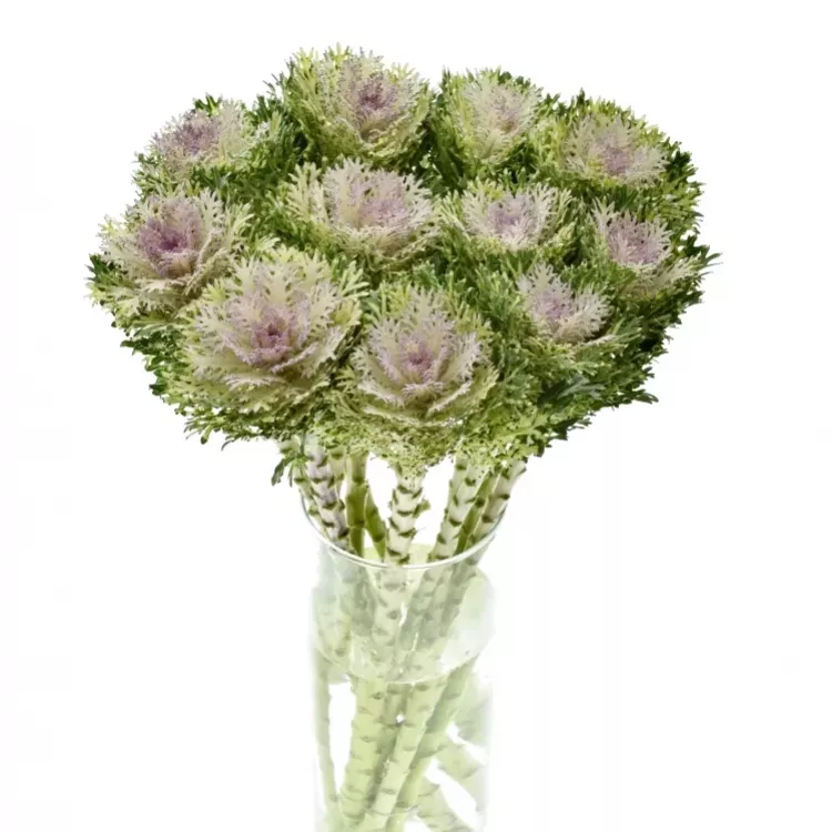 Brassica nebo také ozdobné zelí, je dodáváno na květinové burzy v délkách 45 až 80cm, opět velikost květů lze odhadnout podle počtu v balení od 25ks do 80ks. Podle počtu v balení lze určit velikost květu, čím méně v balení tím větší květy. Barvy jsou od bílé přes žlutou až po tmavě fialovou. Řezaná brassica Vám vydrží ve váze čerstvá až 2 týdny. Balení a rozvoz této květiny je opět formou uložení na sucho, případné deformace květů zmizí, jakmile se květina napije.