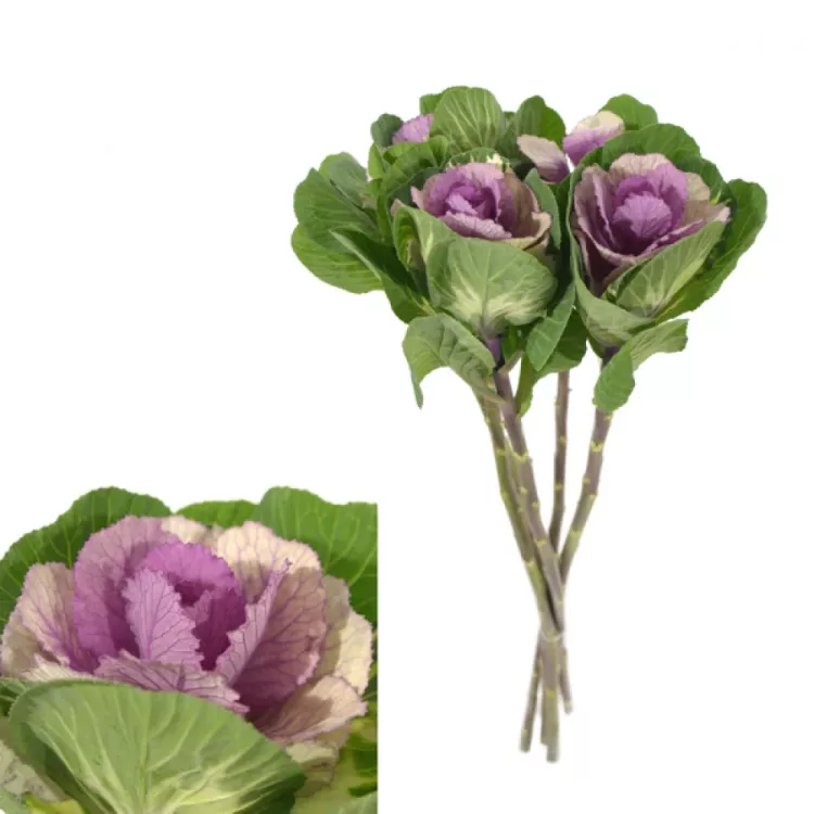 Brassica nebo také ozdobné zelí, je dodáváno na květinové burzy v délkách 45 až 80cm, opět velikost květů lze odhadnout podle počtu v balení od 25ks do 80ks. Podle počtu v balení lze určit velikost květu, čím méně v balení tím větší květy. Barvy jsou od bílé přes žlutou až po tmavě fialovou. Řezaná brassica Vám vydrží ve váze čerstvá až 2 týdny. Balení a rozvoz této květiny je opět formou uložení na sucho, případné deformace květů zmizí, jakmile se květina napije.