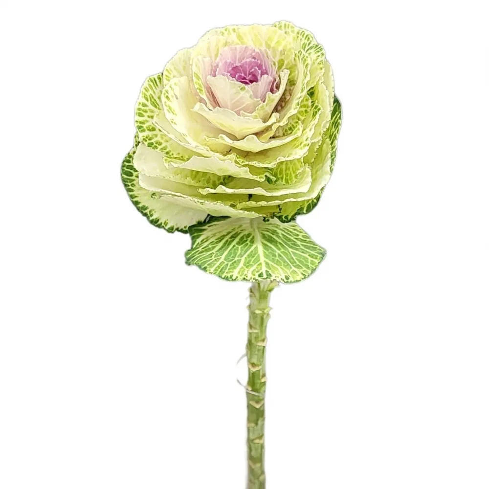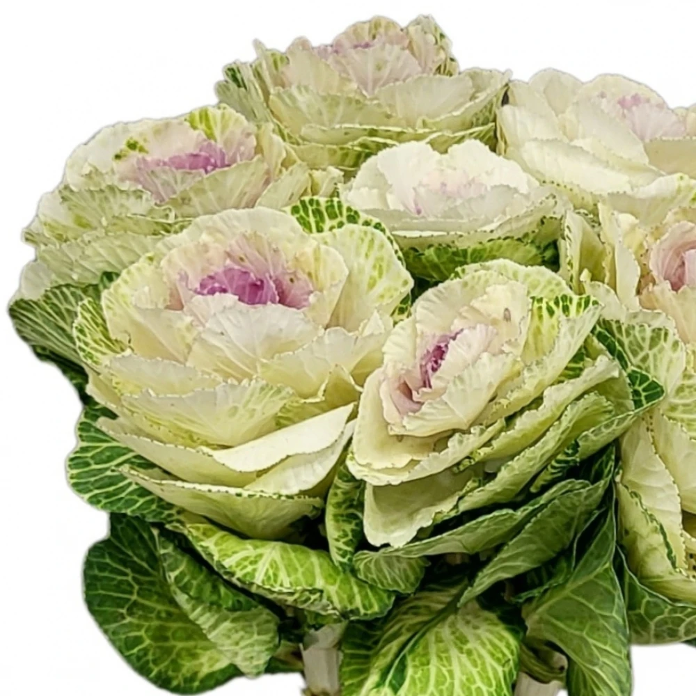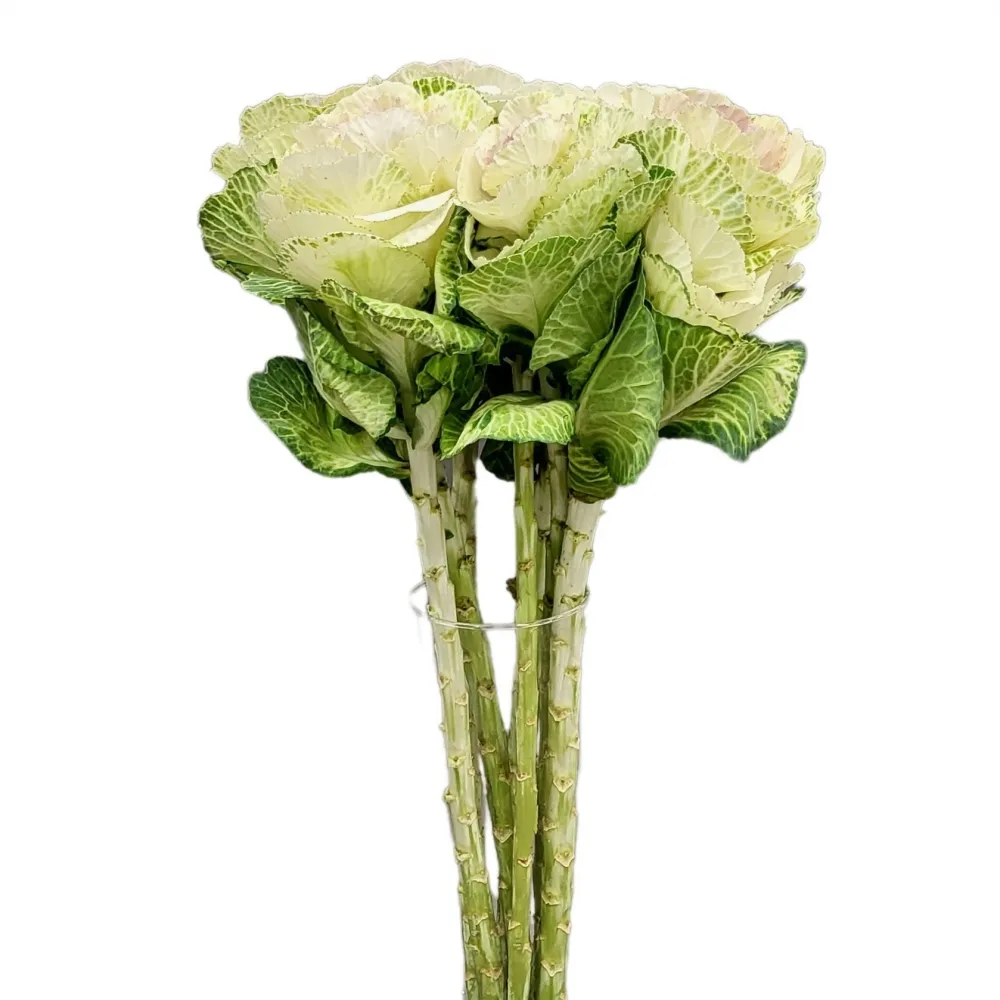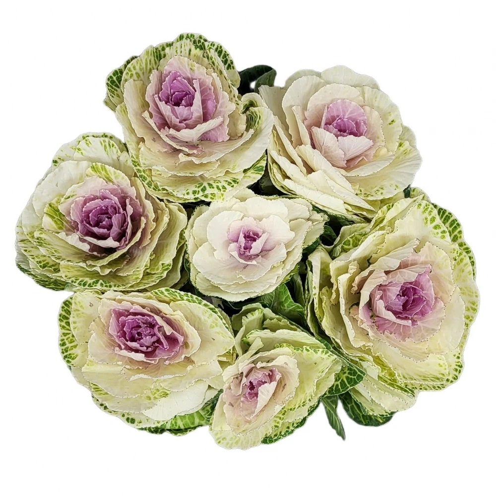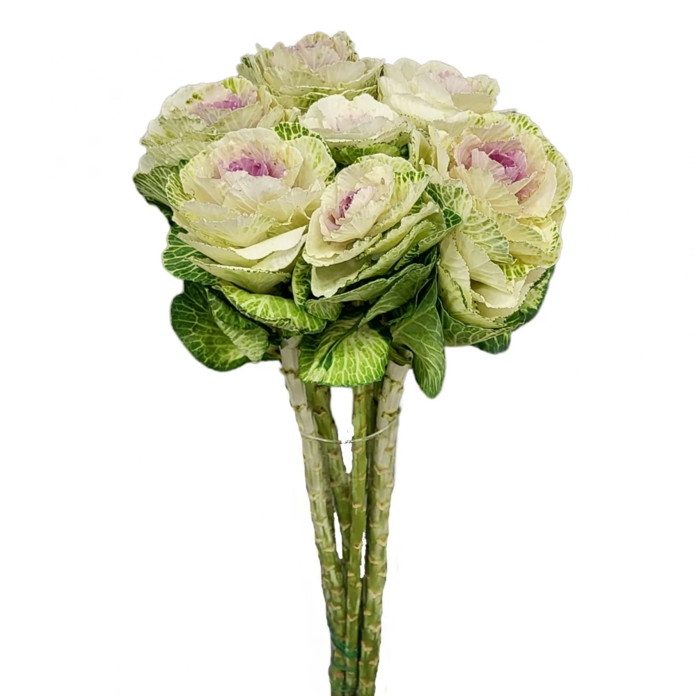 Brassica nebo také ozdobné zelí, je dodáváno na květinové burzy v délkách 45 až 80cm, opět velikost květů lze odhadnout podle počtu v balení od 25ks do 80ks. Podle počtu v balení lze určit velikost květu, čím méně v balení tím větší květy. Barvy jsou od bílé přes žlutou až po tmavě fialovou. Řezaná brassica Vám vydrží ve váze čerstvá až 2 týdny. Balení a rozvoz této květiny je opět formou uložení na sucho, případné deformace květů zmizí, jakmile se květina napije.