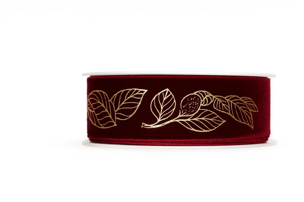 - Potištěná sametová stuha s listy červená 38mm x 6m