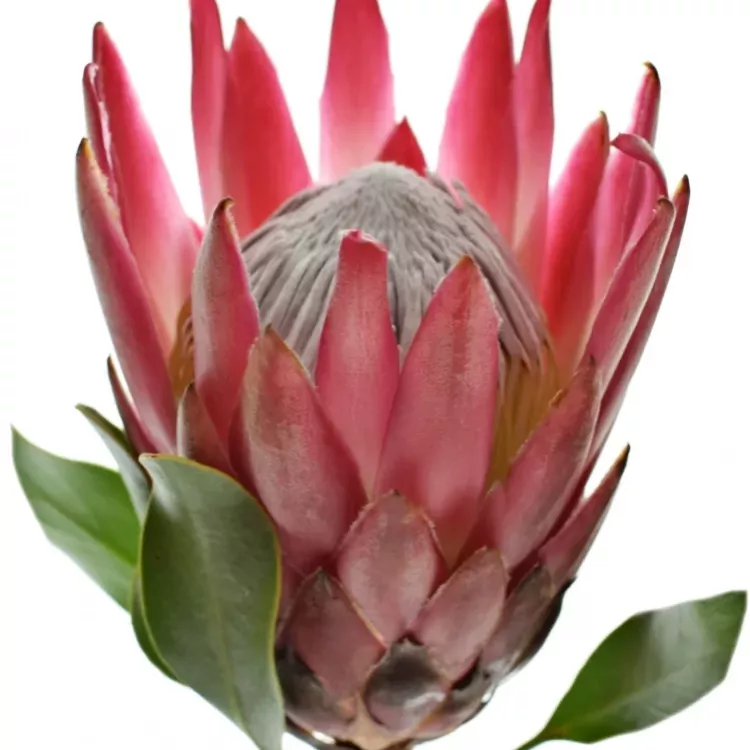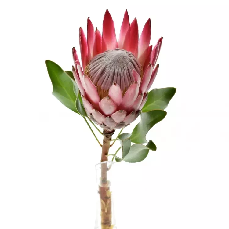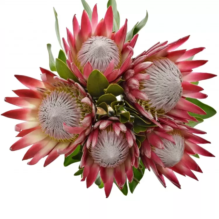 Protea jsou květy keřů a stromů z jižní Afriky, existuje mnoho variant tvarů a barev této zajímavé řezané květiny. Oschlá spodní patra listů pod květem nejsou vadou.