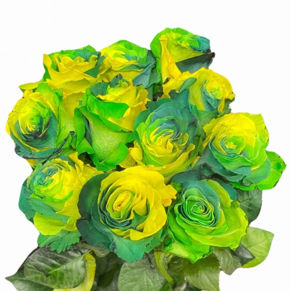 Růže RAINBOW GREEN YELLOW s květem o velikosti XXL. Růže označené EQ pochází z Ekvádoru, z farem s vysokou nadmořskou výškou. Vyráběné z prvotřídních krémových nebo bílých růží, jsou růže zvýrazněné živými odstíny zelené a žluté, vytvářející pocit oázy ve vašem domově. Všechny úpravy jsou zdravotně nezávadné.