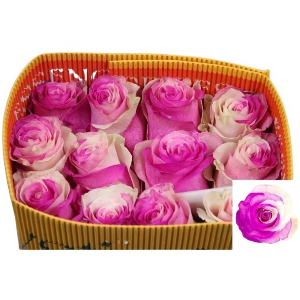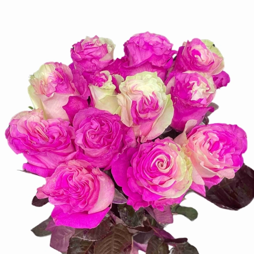 Duhové růže YIN YANG HOT PINK s květem o velikosti XXL. Růže označené EQ pochází z Ekvádoru, z farem s vysokou nadmořskou výškou. Jsou skvostem mezi řezanými květinami, vznikají proměnou prémiových bílých růží do růžových odstínů, přičemž všechny procesy jsou zdravotně nezávadné.
