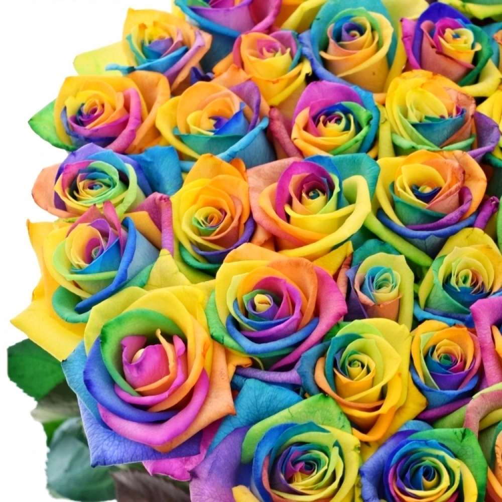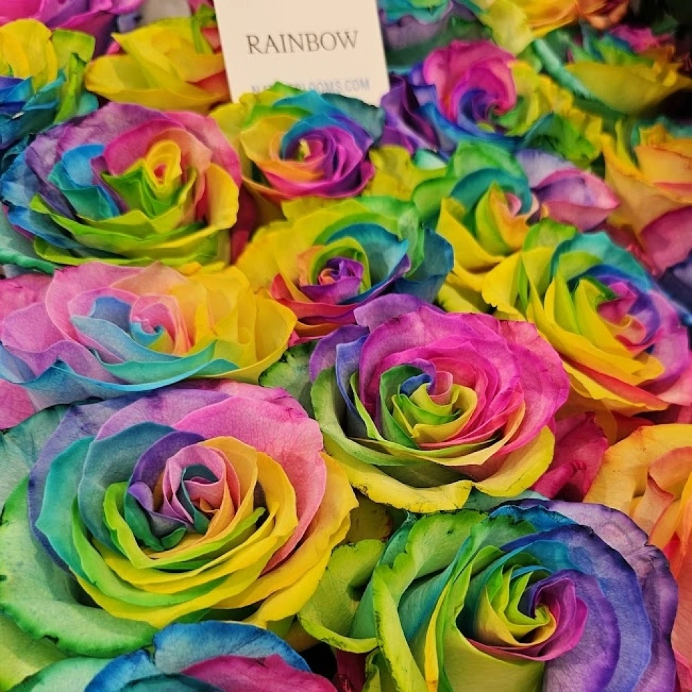 Superprémiová růže Rainbow s obrovskými květy. Růže označené EQ pochází z Ekvádoru, z farem s vysokou nadmořskou výškou. Ta poskutuje rostlinám ideální podmínky pro růst extrémně silných stonků a obřích květů. Patří do kategorie výběrových a drahých růží.