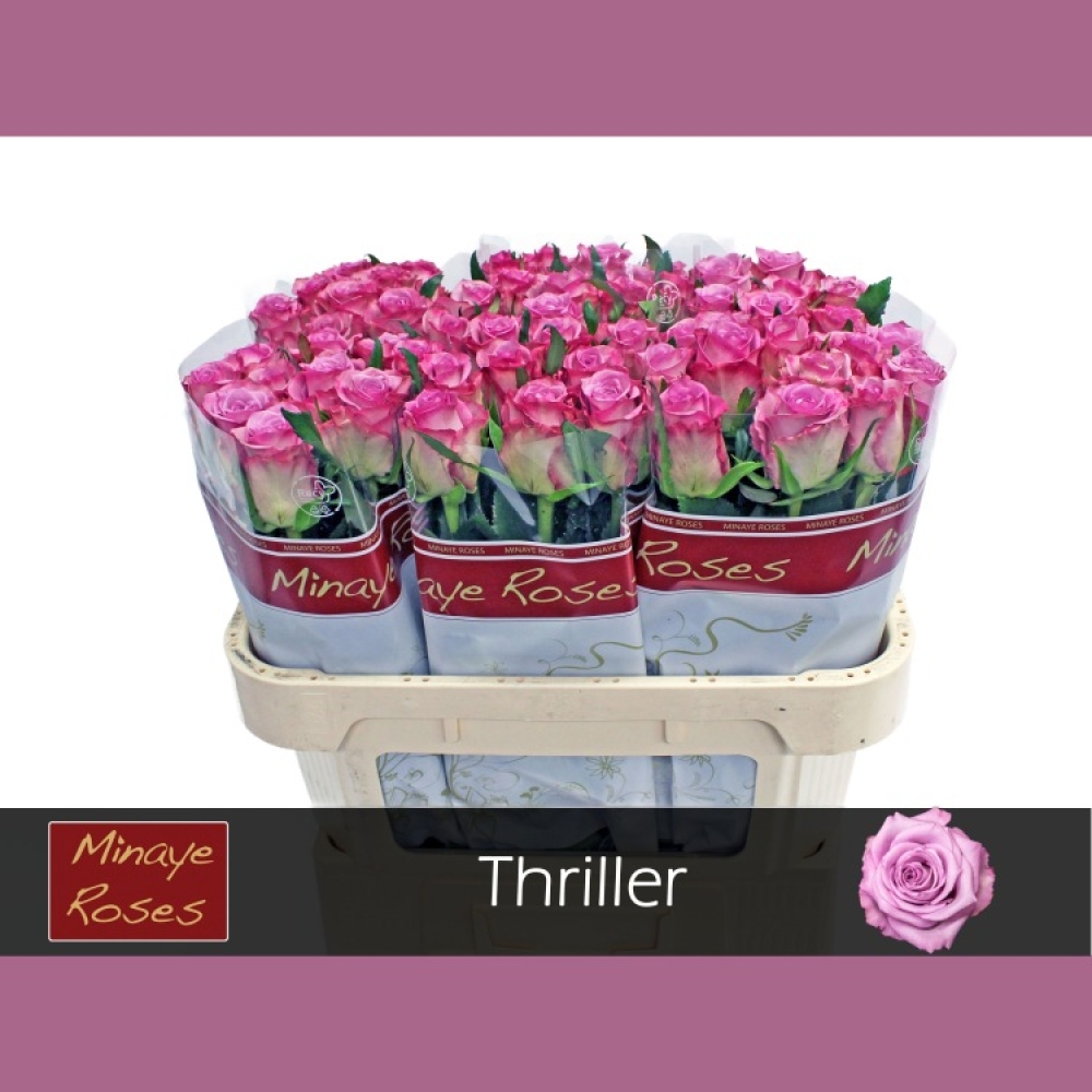 Thriller (často uváděná i jako Thriller+) je růže v netradičním odstínu purpurové až fialovo růžové, která v kytici udělá výrazný, ale stále elegantní akcent. Vyniká pevnými okvětními lístky, spolehlivým rozkvětem a tím, že i po několika dnech ve váze působí pořád upraveně.