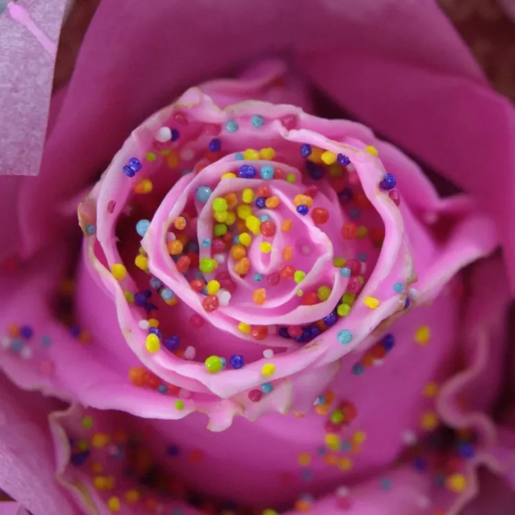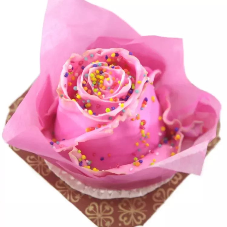 Růžová růže Cupcake Chocolate Disco Pink je sladký a nejedlý dárek, který bude milým doplňkem např. k tradiční kytici z růží. Tato dekorace z čerstvé růže totiž vydrží o něco déle než normální kytice. Růže je zalita parfemovaným voskem, posypána perličkami a nasazena na papírový podtácek.