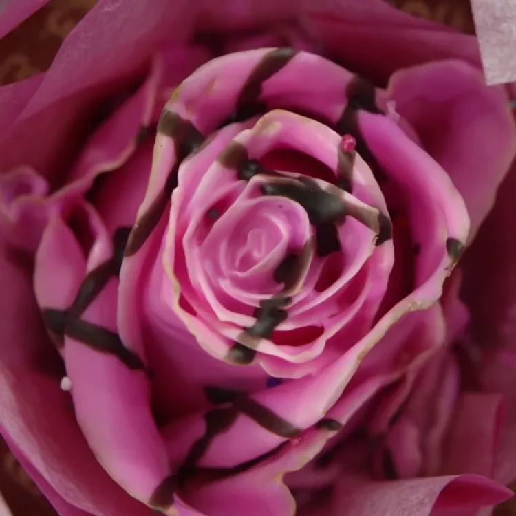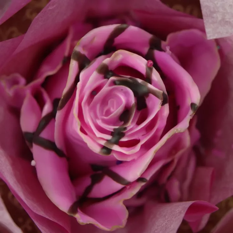 Cupcake Chocolate Strip Pink je mistrovským dílem z dílny V.I.P. Roses Sassen. Tyto speciální růže jsou láskyplně polity čokoládou a zdobeny růžovou barvou a hnědými proužky na prémiových krémových nebo bílých růžích.