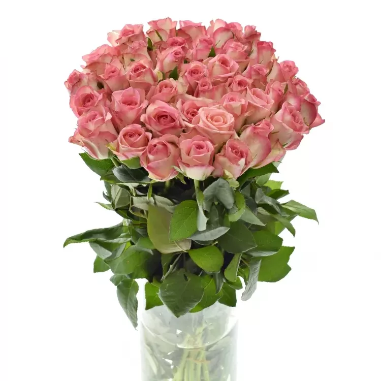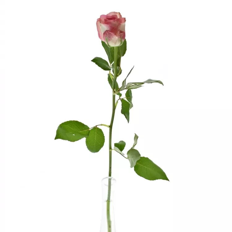 Růže GLOSSY o velikosti květu M vyniká svými růžovo-bílými okvětními lístky, které jsou přirovnávány k něžnému líčení raného jara. Její stonky dosahují optimální délky, která umožňuje její využití jak v bujné kytici, tak i jako jednotlivý elegantní prvek ve váze.
